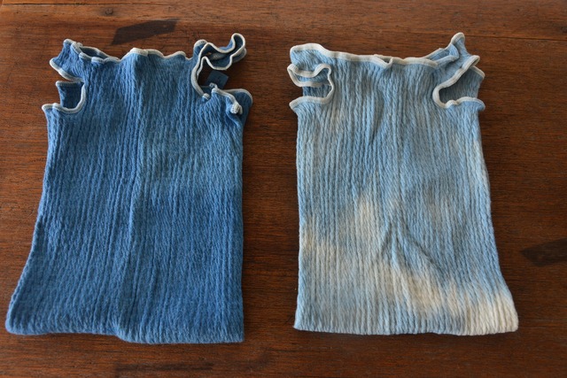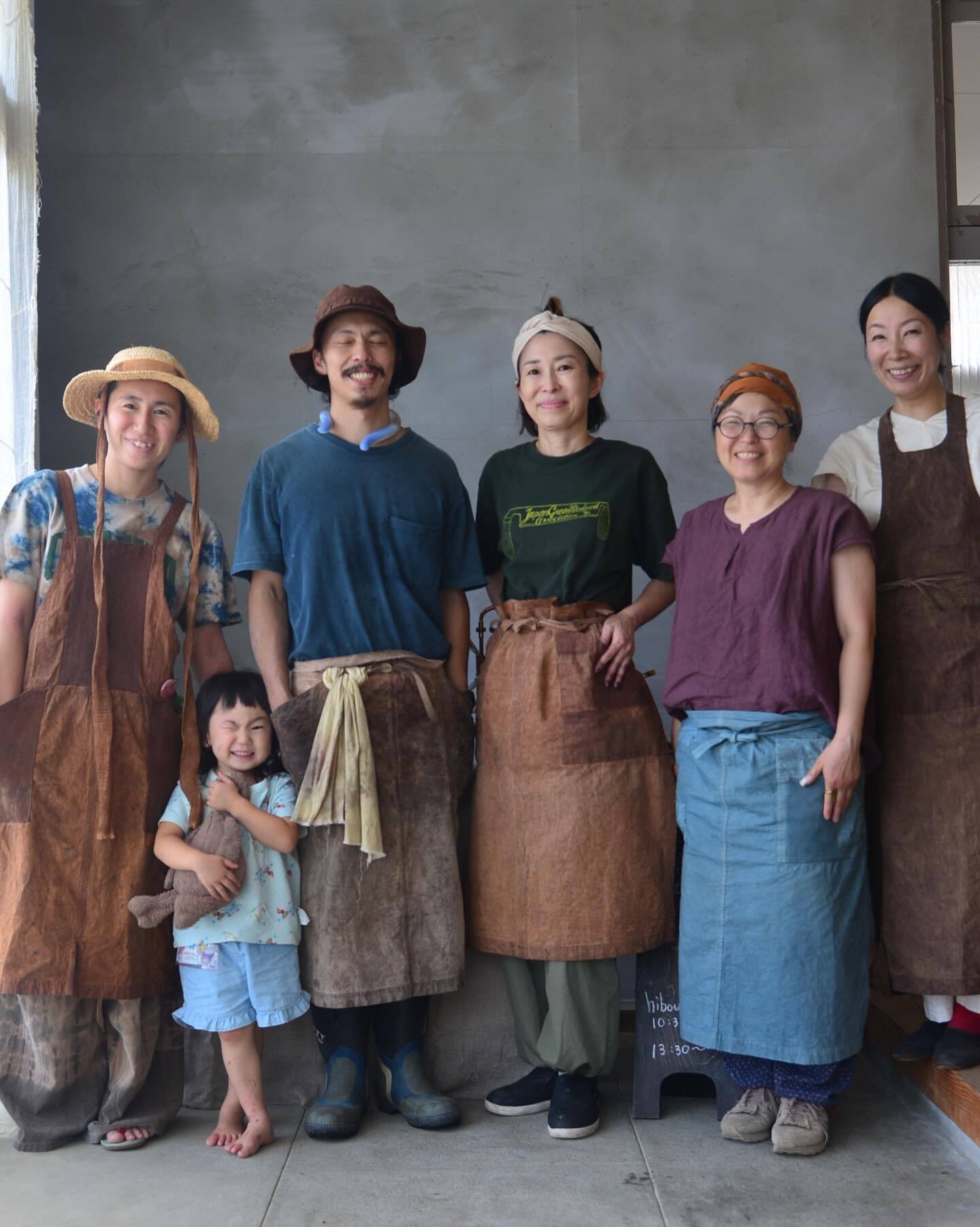 私たちは藍建てや管理に一切化学物質を使用しない本藍建て(天然灰汁発酵建)や正藍染と言う方法を独自に思考錯誤しながら藍染しています。 化学的な薬品を使った藍染や化学染料とは違い、沢山の染めを何度も重ねながらゆっくり染めていくものです。 その分、人にもお肌にも環境にも優しく、すぐに色落ちせずゆっくり穏やかな経年変化を楽しんでいただけます。 普段私たちのお店、『てとてびと商店』で扱わせてもらっているプロダクトを『染〼』という屋号で藍染したコラボ商品になります。