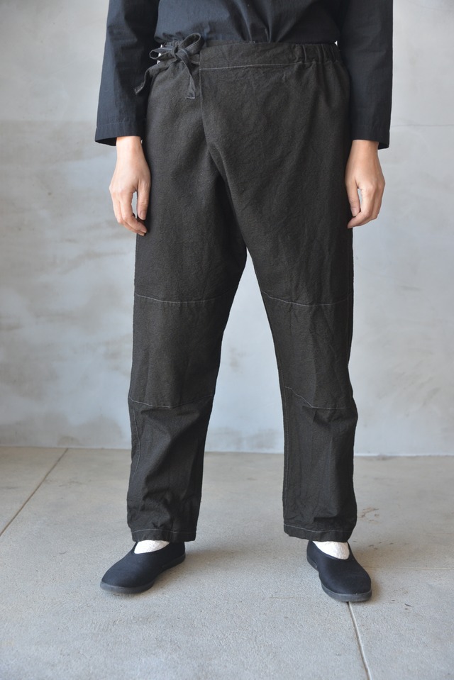 『重ねもんぺパンツ』 日本の伝統的な野良着のもんぺからの発想とパターン展開で作られた重ねもんぺパンツ。 ウエストには大部分にゴムと紐が通っていて、紐を引いて調整します。 もんぺが元になっている上、ウエストの重ねた部分を紐で結んで着るため、股下の運動量も大きく、動きやすさもバッチリ。 紐や合わせの部分で綺麗な印象にも見えて格好もつく、それでいて楽ちん、膝当て、ポケットも一つ付いており機能性もあり。 韓服パンツより丈が長めの設定で、男女年齢問わずとても幅広い方に手にとっていただいています。 古い織り機で高密度に織られた綾織りの布は、昔の学生服の生地を復刻した織りで、織っているのは岡山の機屋さん1箇所のみ。 コーマ糸と言うぬめりや光沢のある糸で高密度に綾織されているため、綺麗めなしっとりした質感です。 てとてびとの綿生地の中では厚手でそれなりに重量と存在感があり、風通しがかなり少ないため冬場もレギンスなどを下にはけば過ごしていただけます。 染色は染工場さんで備長炭と顔料で染められたものです。 個性と存在感のある表情で、染まりつきが均一ではないため通常のブランドでは中々使うことが難しいそうです。 顔料なので最初色落ちも多少ありますが、ジーンズのようにあたりが出てきて経年変化を楽しんでいただけます。 素材:綿100% 染め:備長炭×顔料 サイズ:1、2 寸法:サイズ1 総丈92cm 股下67cm 裾周り38cm サイズ2 総丈96cm 股下69cm 裾周り40cm サイズ2は男性の方や長身の方にもよく選んでいただいています。 私達夫婦はサイズ1をはくことが多いです。(私158、夫164) ※寸法には多少の誤差がありますのでご了承ください。 モデル:158㎝