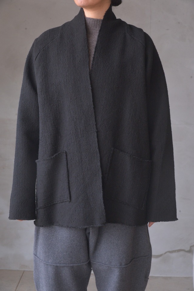 MITTANのオーガニックコットン×絹紬糸のガラ紡ジャケット ぽこぽことしたガラ紡特有の手織りの様な表情のある生地は、絹(つむぎ)糸と尾州地方に残るガラ紡と言う古い機械で紡いだオーガニックコットンの糸で作られたオリジナルの生地です。 素材感を活かした表情豊かな生地使いと綿と絹による柔らかな肌触りが特徴の素材です。 程よい厚みと保温性のある生地のため、秋から春まで活躍する羽織りです。冬はカーディガン感覚でアウターの中にあわせることもできます。 袖口にはカフスがないため、体型にあわせて袖を折返して着用することができるため、幅広い体系の方に合いやすいです。 前立ては生地の耳を使用し、裾や袖口は切りっぱなしの仕様で作られています。 また、リバーシブルで着用することができるため、裏返すと縫製の剥ぎ部分が表に見えて、印象が異なります。 素材:綿55% 絹45% 染め:黒染 サイズ:身幅52cm 着丈71cm 裄丈86cm ※多少の誤差があります。 モデル:男性180㎝ 女性158㎝ ※屋外(太陽光)と、室内(蛍光灯)とでは色の見え方には違いがございます。 ご使用のモニターや環境によっても実際の商品とカラーが多少異なって見える場合がございます。予めご了承下さい。 〇MITTANの公式商品紹介ページにて詳しく解説されておりますので下記URLよりご一読ください。 https://mittan.shop/products/jk-07/ オーガニックコットンの落ち綿を混ぜた綿を、ガラ紡で紡績した糸を緯糸に、屑繭等、絹の製糸に使用できない部分を再度紡績した絹紡紬糸を経糸に使用して、ションヘル織機で山型の斜文組織柄に織ったオリジナル生地を使用しています。ガラ紡によって作られる糸の節感が、低速で織られるションヘル織機独特の柔らかさと相成って、まるで手織りのような風合いとなっています。衿端にションヘル織機によって作られる生地耳をそのまま使用することで、身頃も少しバイアスとなった、体に馴染むパターンです。衿は立たせることも、折り返すこともでき、袖も好きな長さに折って調整ができます。またごく細かい針目で縫製することで裏側をフサ感のある切りっ放しの仕様としました。リバーシブルでも着用可能で、表側にパッチポケットがあります。 MITTANは購入後のケアの手厚いブランドとなっています。 修繕のご相談、修繕事例 https://mittan.asia/repair/