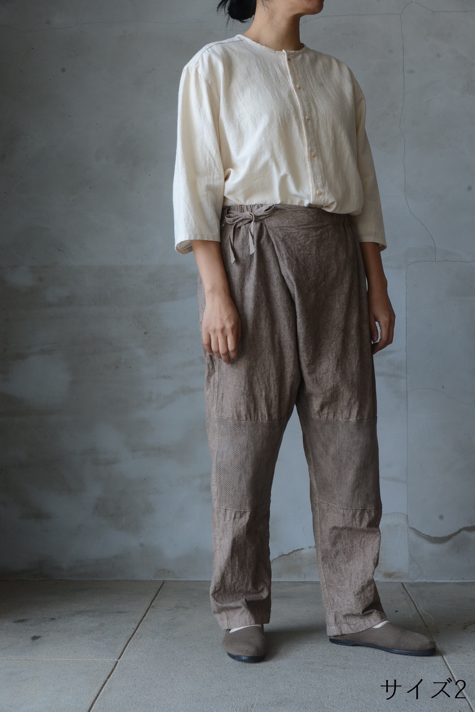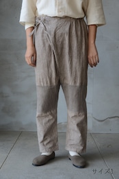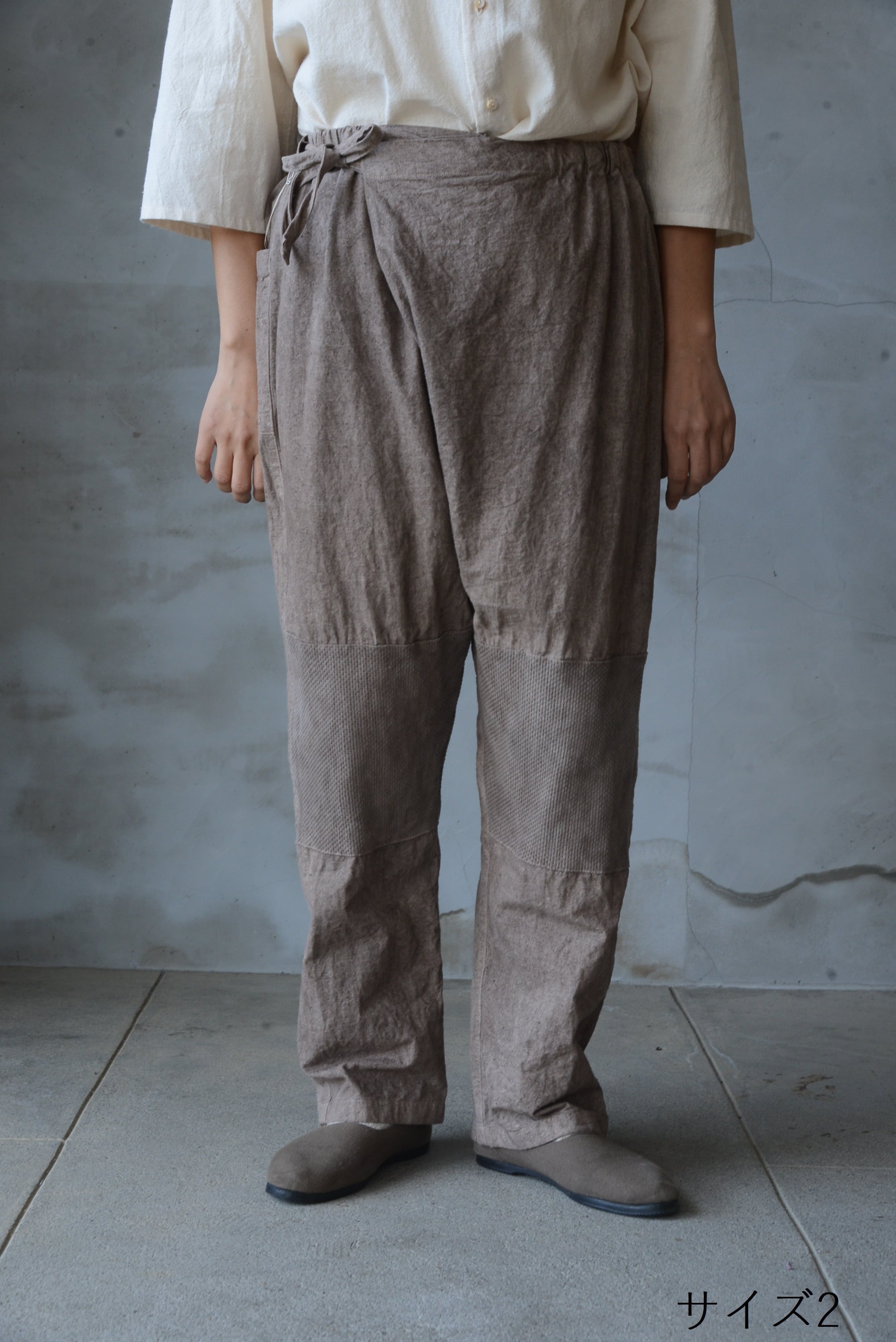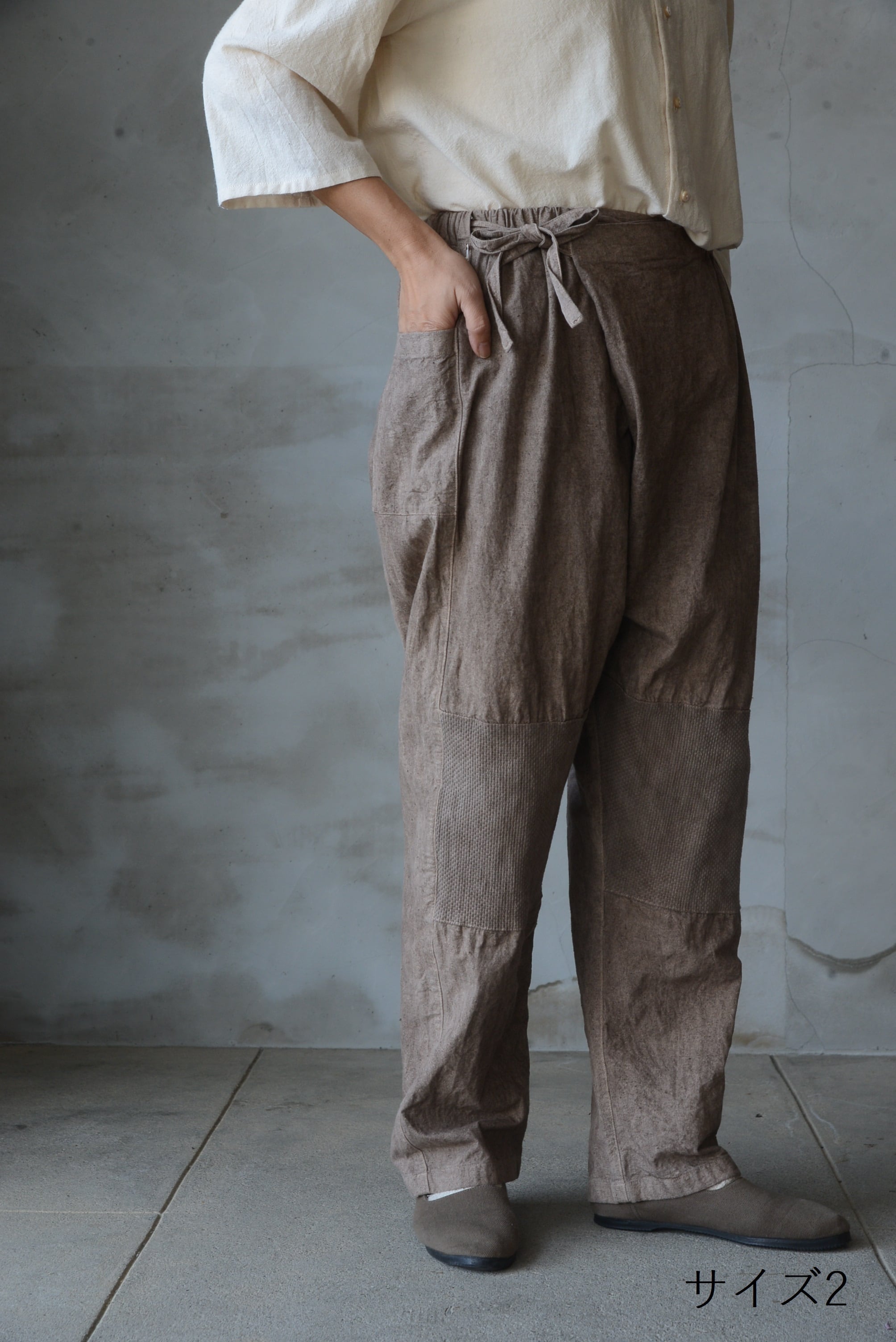 日本の伝統的な野良着のもんぺからの発想とパターン展開で作られた重ねもんぺパンツ。