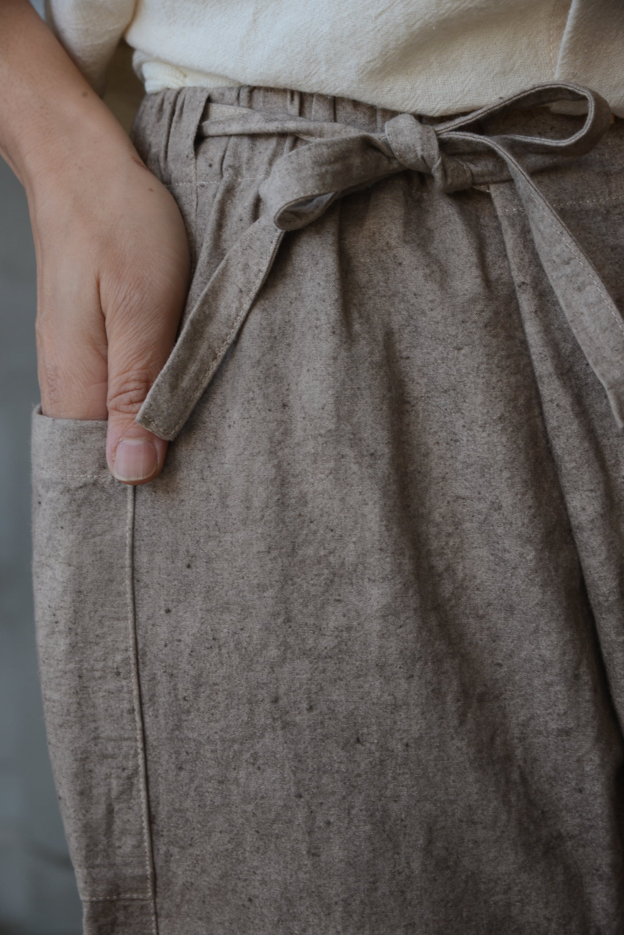 適度な張り感のある生地で、強撚糸の経糸とネップのある緯糸で高密度に織られていて丈夫です。古い織機で低速に織ったおり、味わい深い表情で経年変化も楽しめます。