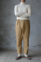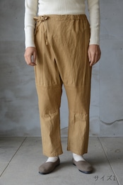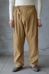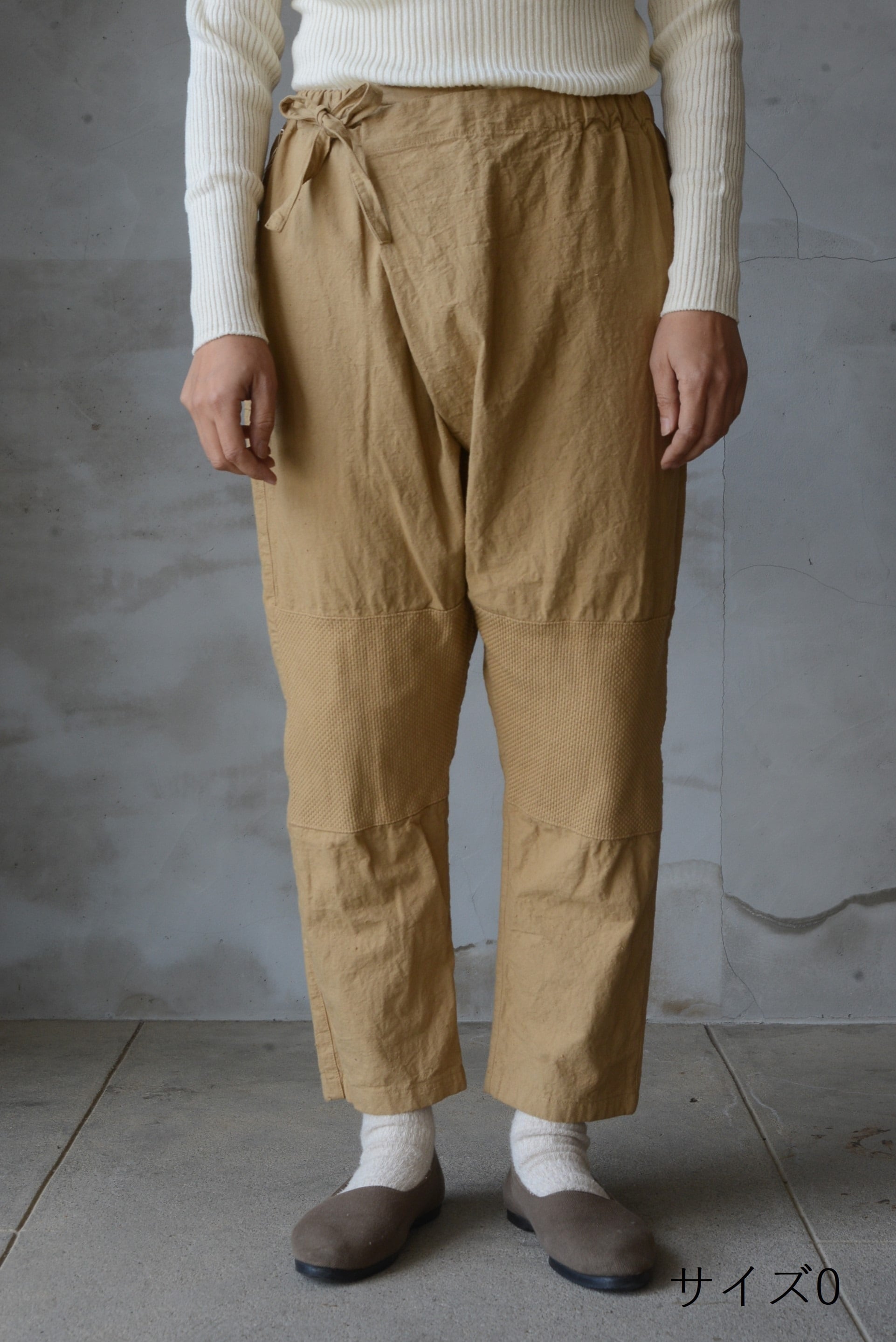 日本の伝統的な野良着のもんぺからの発想とパターン展開で作られた重ねもんぺパンツ。