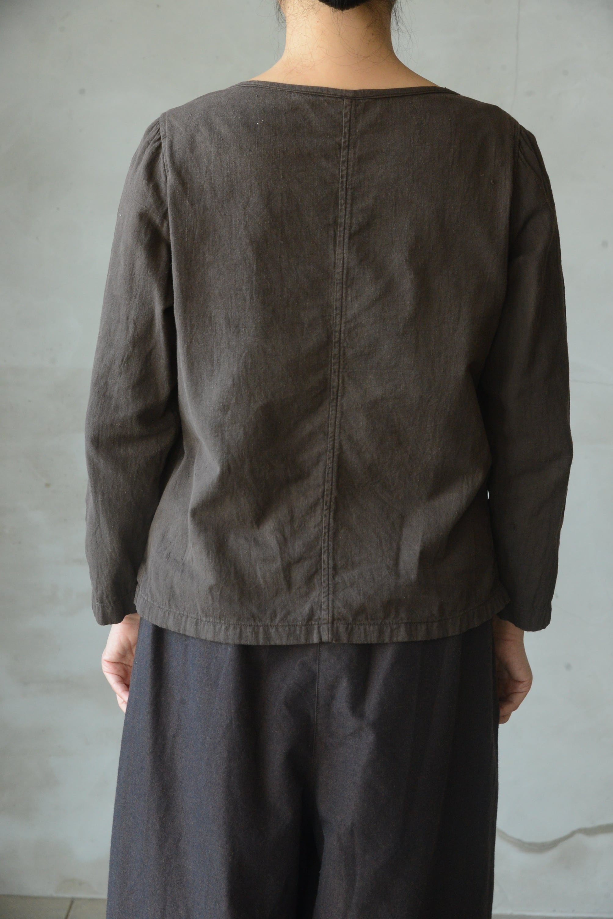 首がつまり気味でも空きがなくても、衿ぐりが重なる仕様のためかぶりで着られ、カットソーの代わりにもなり、伸びたりダレたりしないシャツをイメージしました。