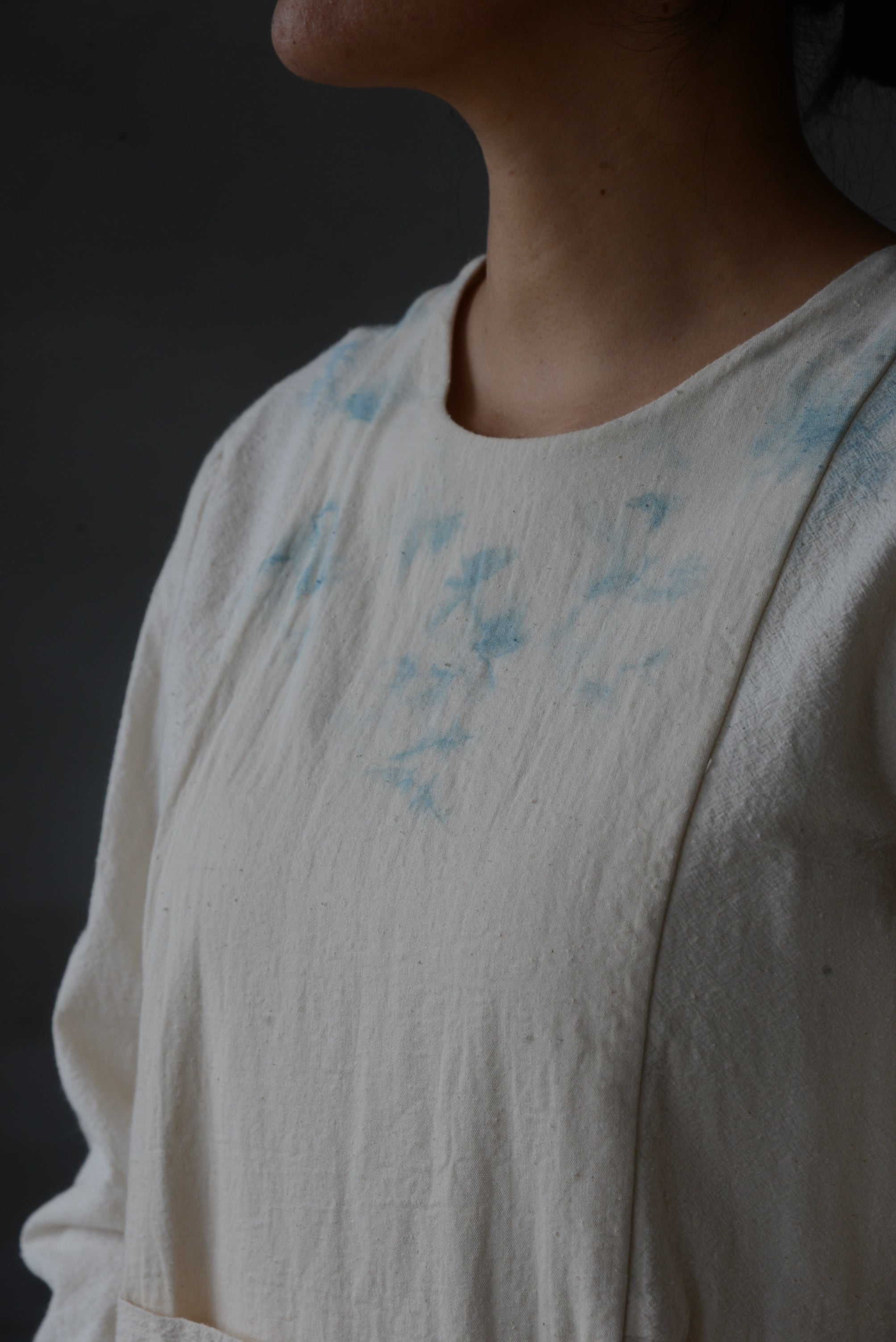 藍で首回りにおっこち染という技法で藍染をほどこしたユニークピースになります。