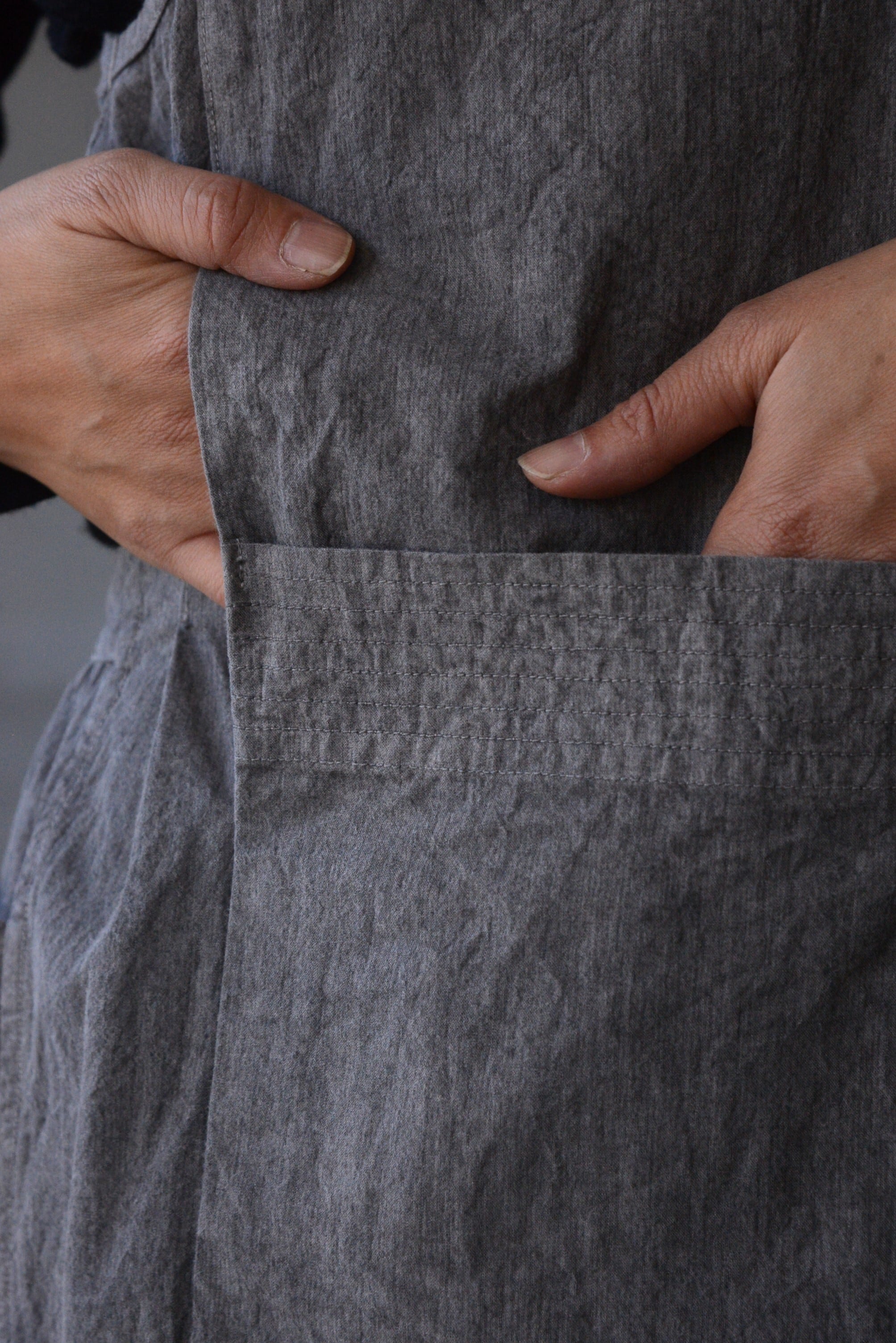 作業と日常の中間にあって、ワーク感とエレガントさも兼ねていて、作業中にそのまま出かけられる様な一枚になったらと思って作った1枚です。