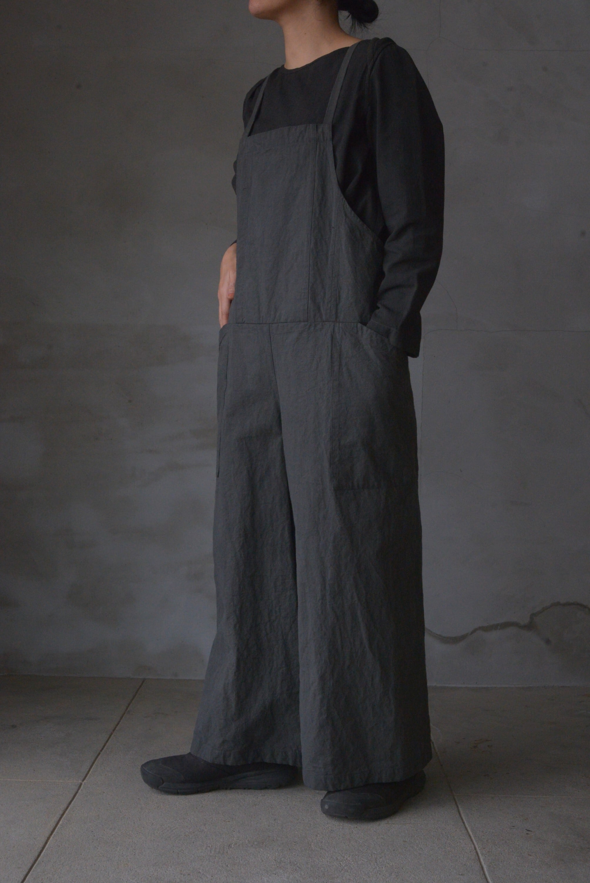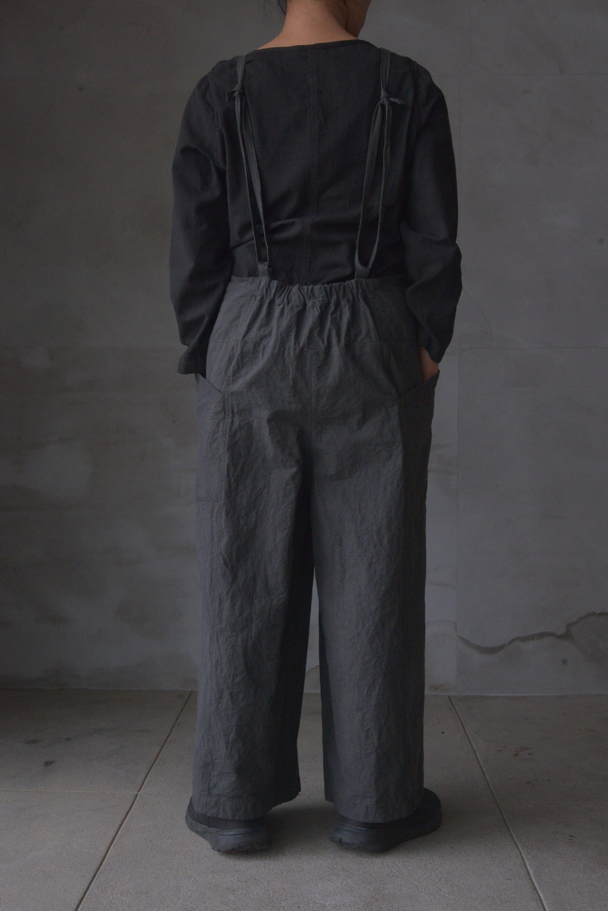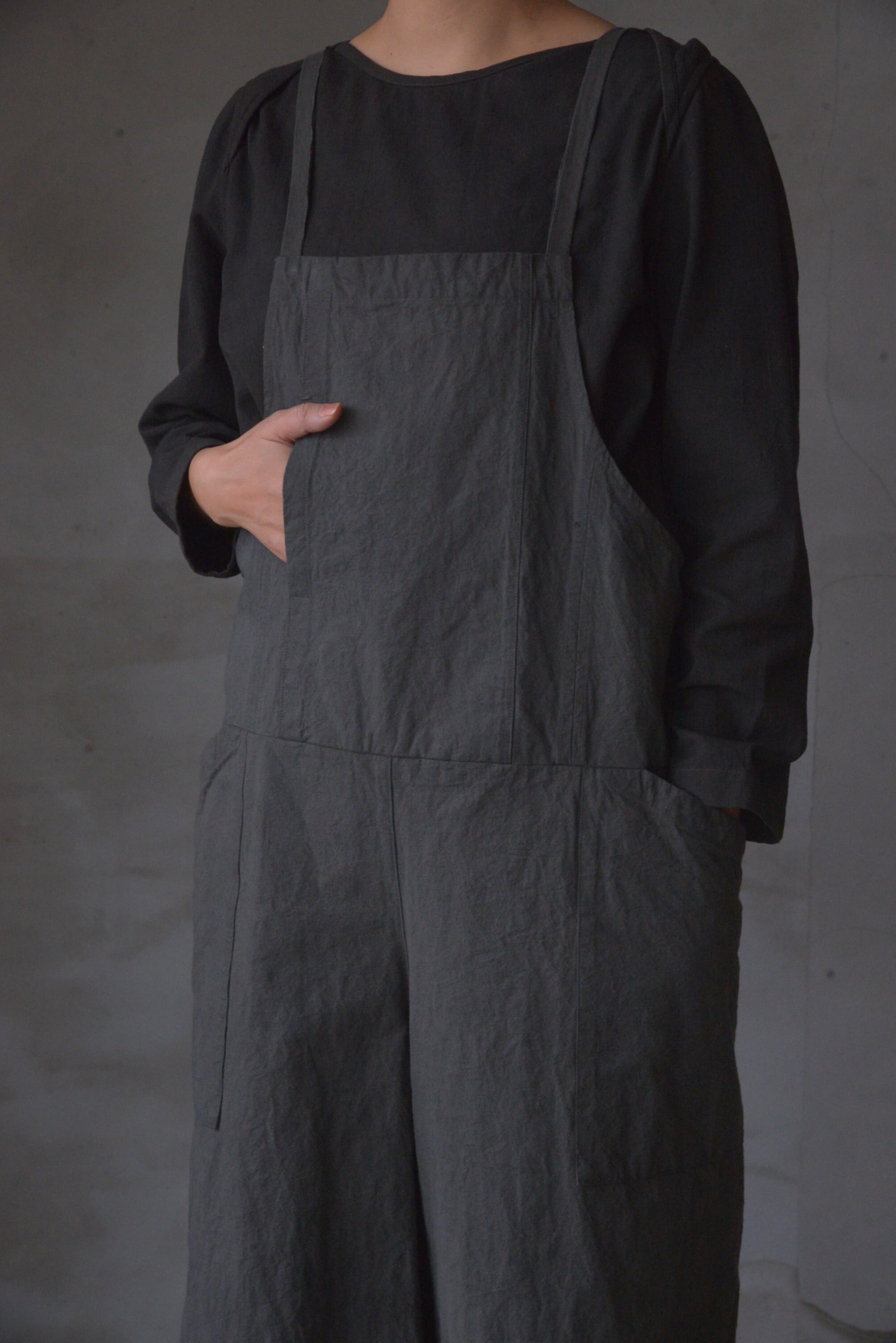 背中で紐はクロスさせていますが、真っすぐにかけたり、自由に結べるため印象を変えて着ていただけます。結び方でシルエットも少し変わります。(5枚目は違う服ですが結び方の参考に)