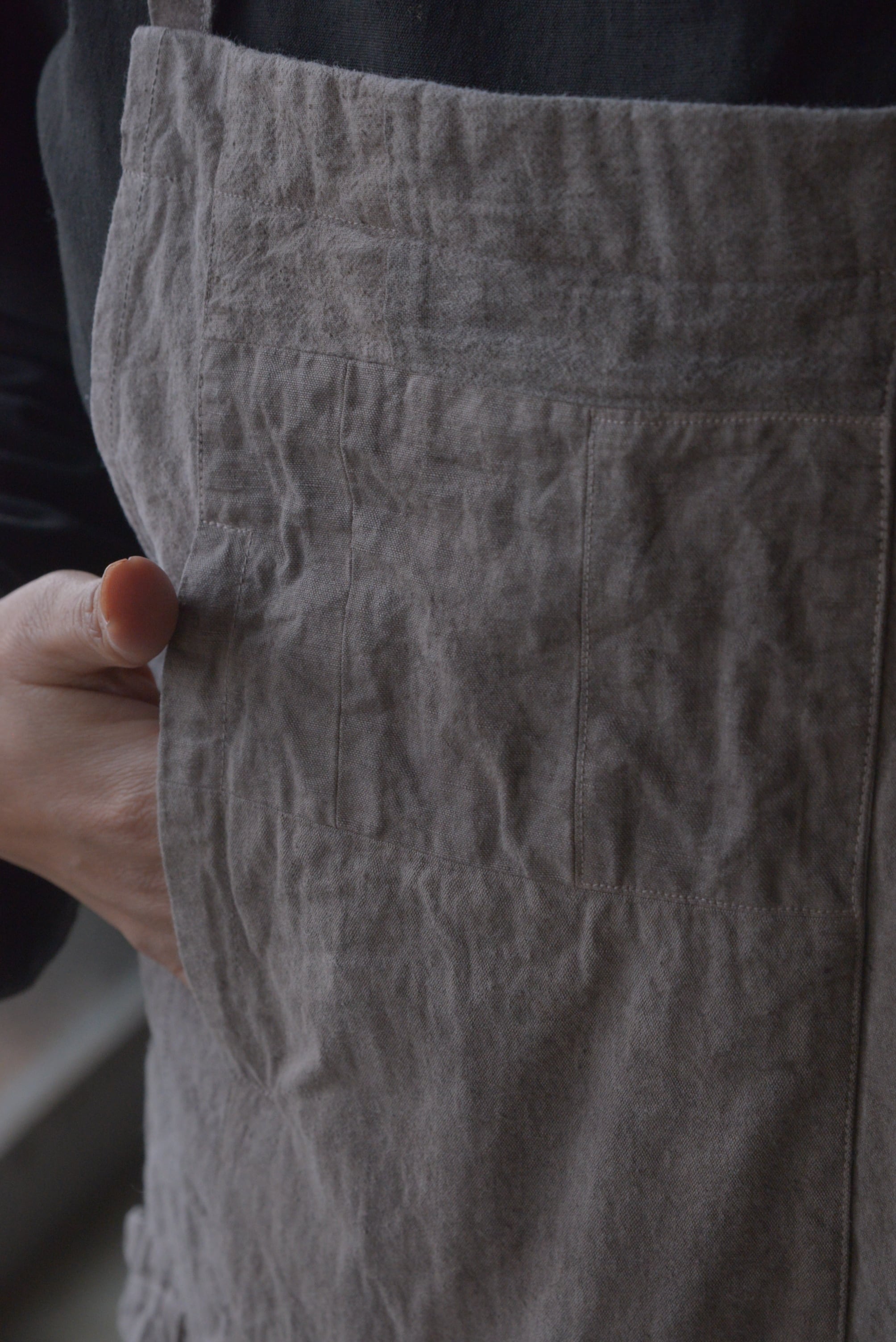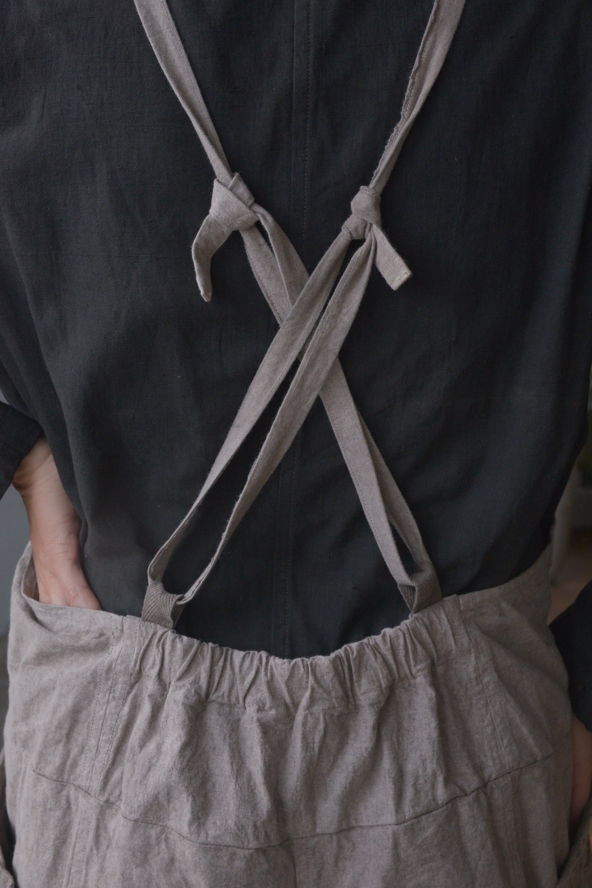 背中で紐はクロスさせていますが、真っすぐにかけたり、自由に結べるため印象を変えて着ていただけます。結び方でシルエットも少し変わります。