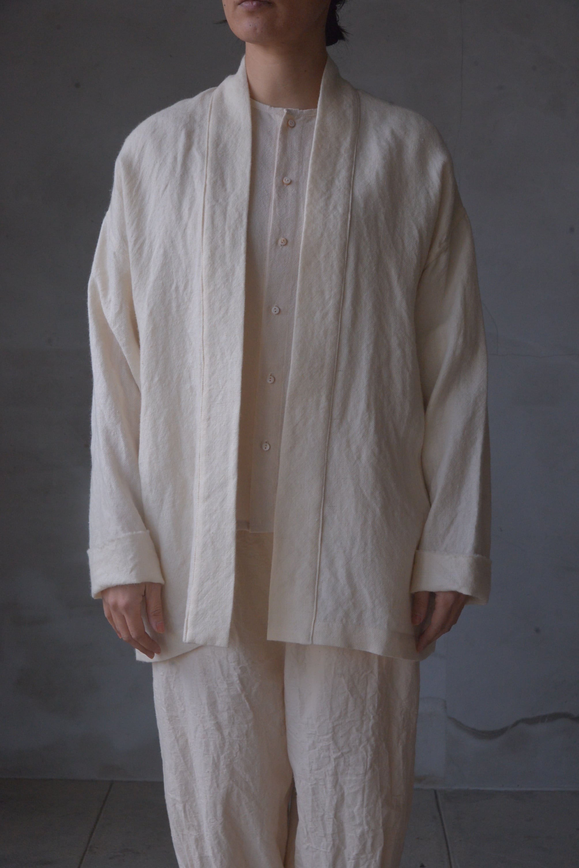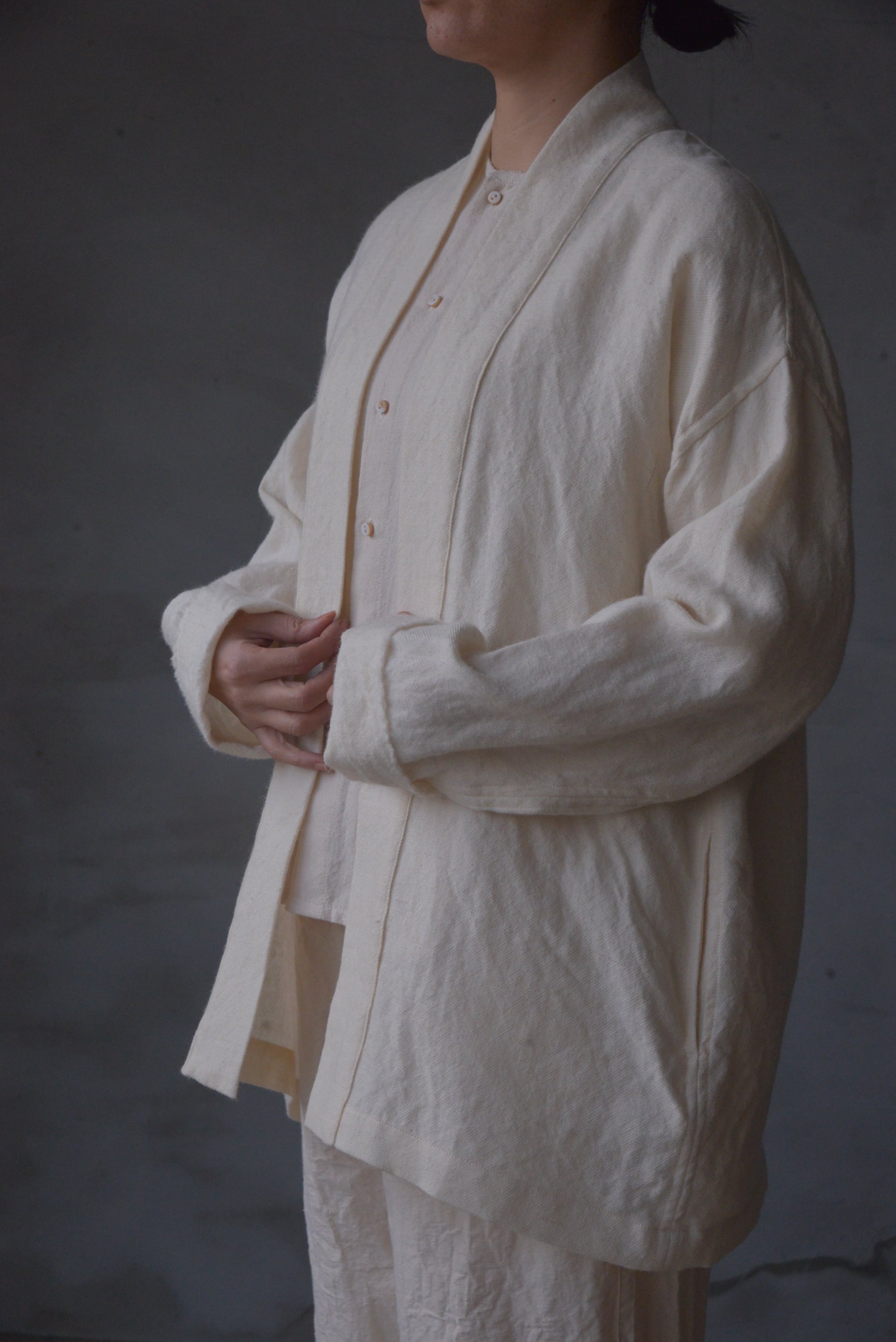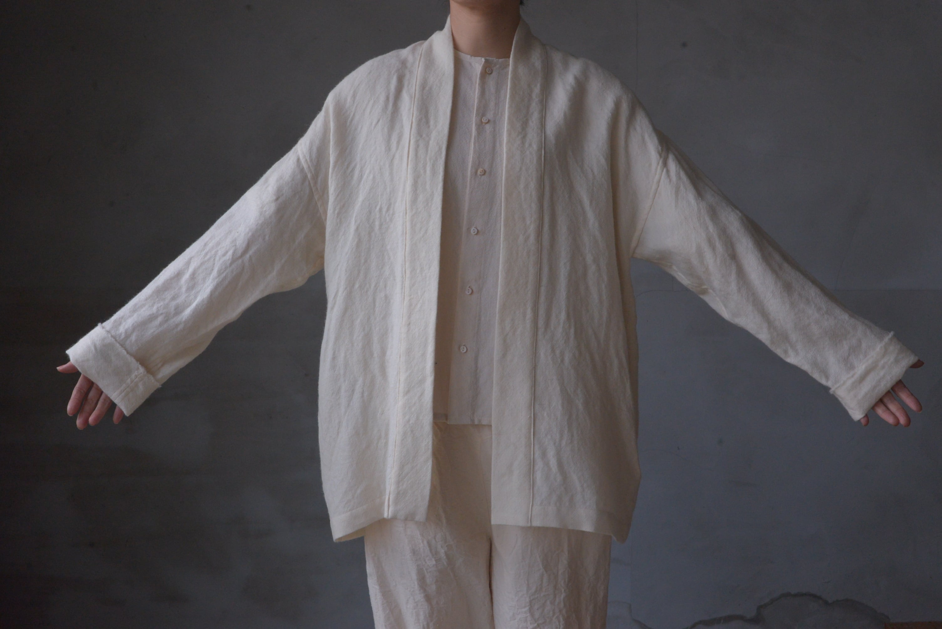 裏無しの一重の仕様、平面的なゆとりのある作りで、下に着こんだりさらっと一枚でも着やすく長いシーズン活躍する一枚です。