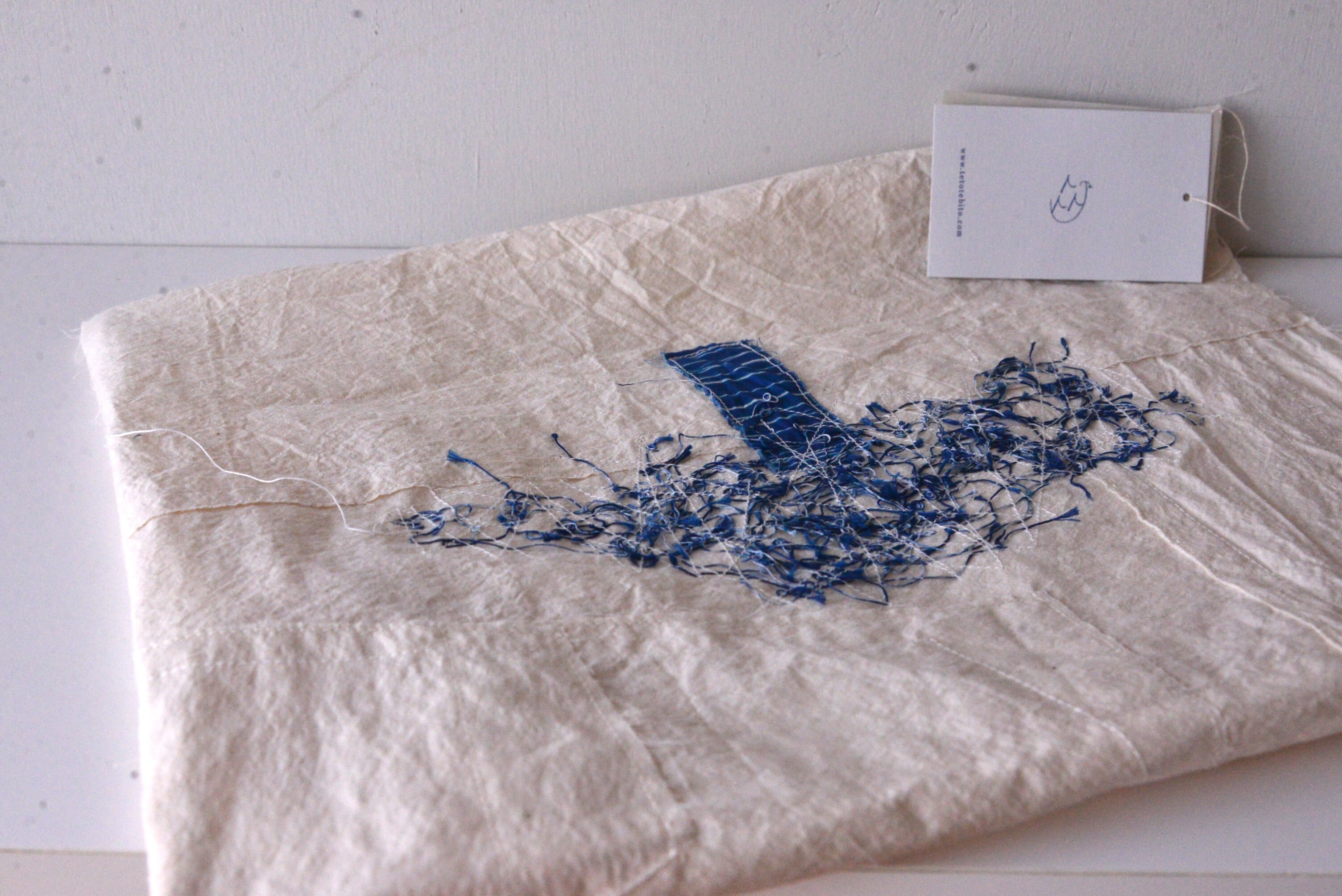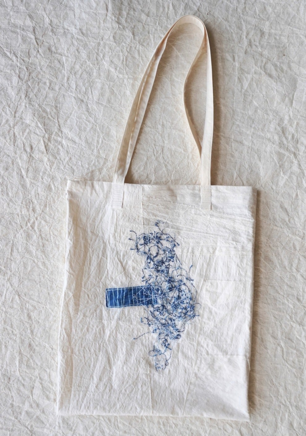 服を作ると残布と、製作の過程の中で生まれる染め糸などを使って製作する世界で一つの袋。