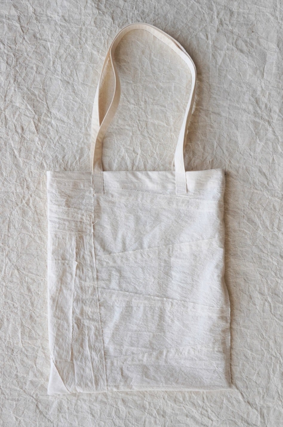 残布を使ったこのおかいものぶくろは縫い代の処理を簡略化し、できるだけ薄く仕上げたり、工賃を抑える工夫をしています。