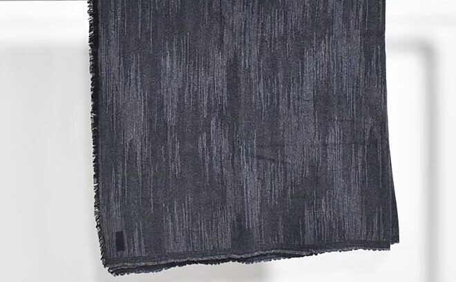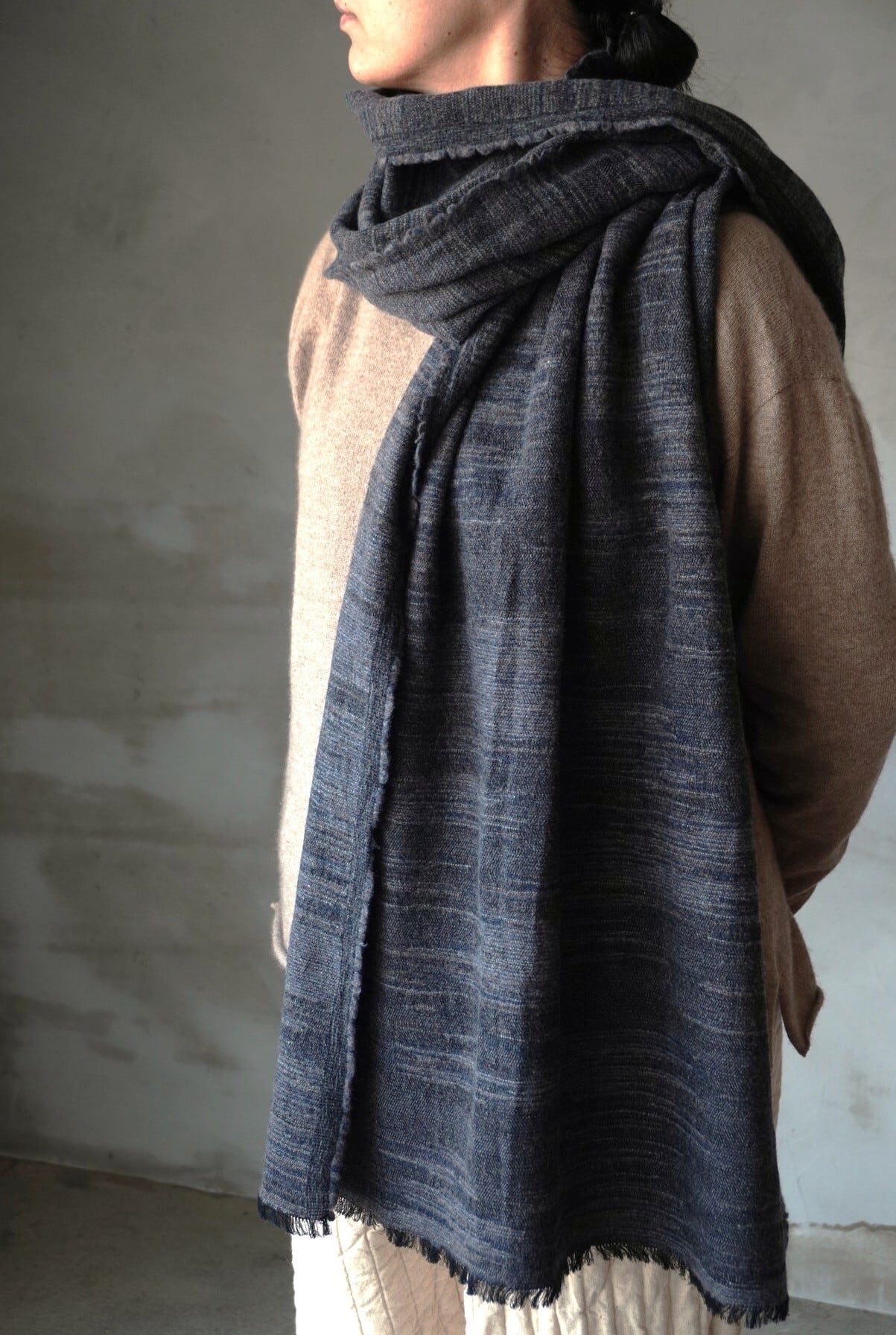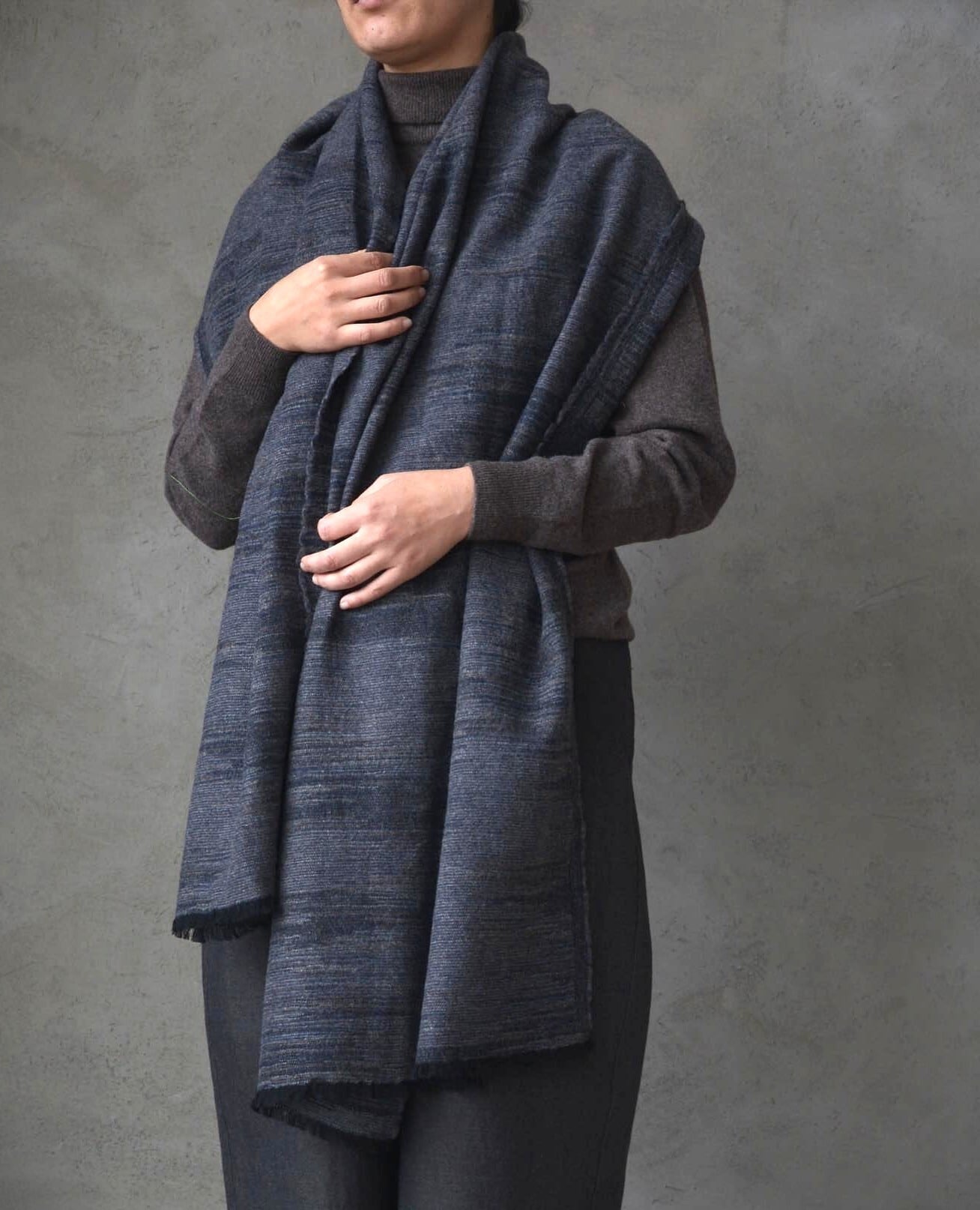 経糸に細い綿糸を使用していますが、実際に肌に触れるのはカシミヤと同じくらいの繊維の細さのウールとなっている為とても柔らかく、肌への負担もほとんどありません。経糸の綿糸が支える事でより柔らかな織りが可能となっていて、緯糸自身と織りの中にそれぞれに空気を十分に含ませる事で暖かさを維持できます。