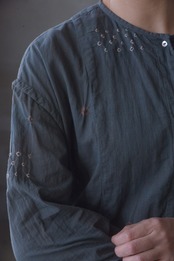所々に有松の伝統技法の鹿の子絞りで柄を作り、阿仙薬と本藍を重ねて染色した、一点物シリーズ。一点一点、表情が異なる手と時間をかけたユニークピース。