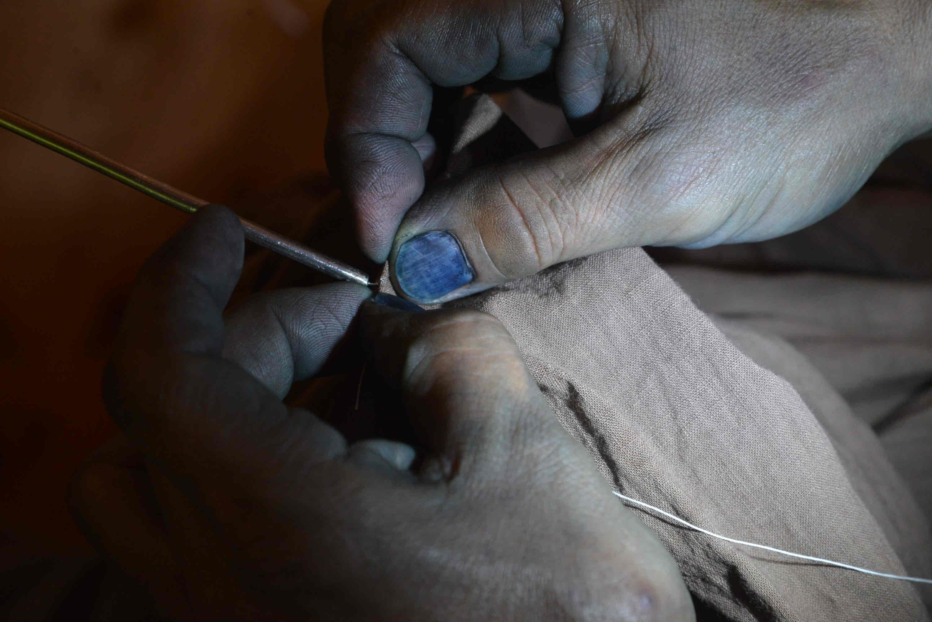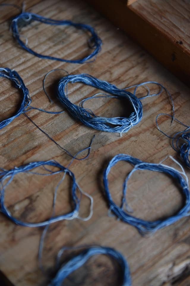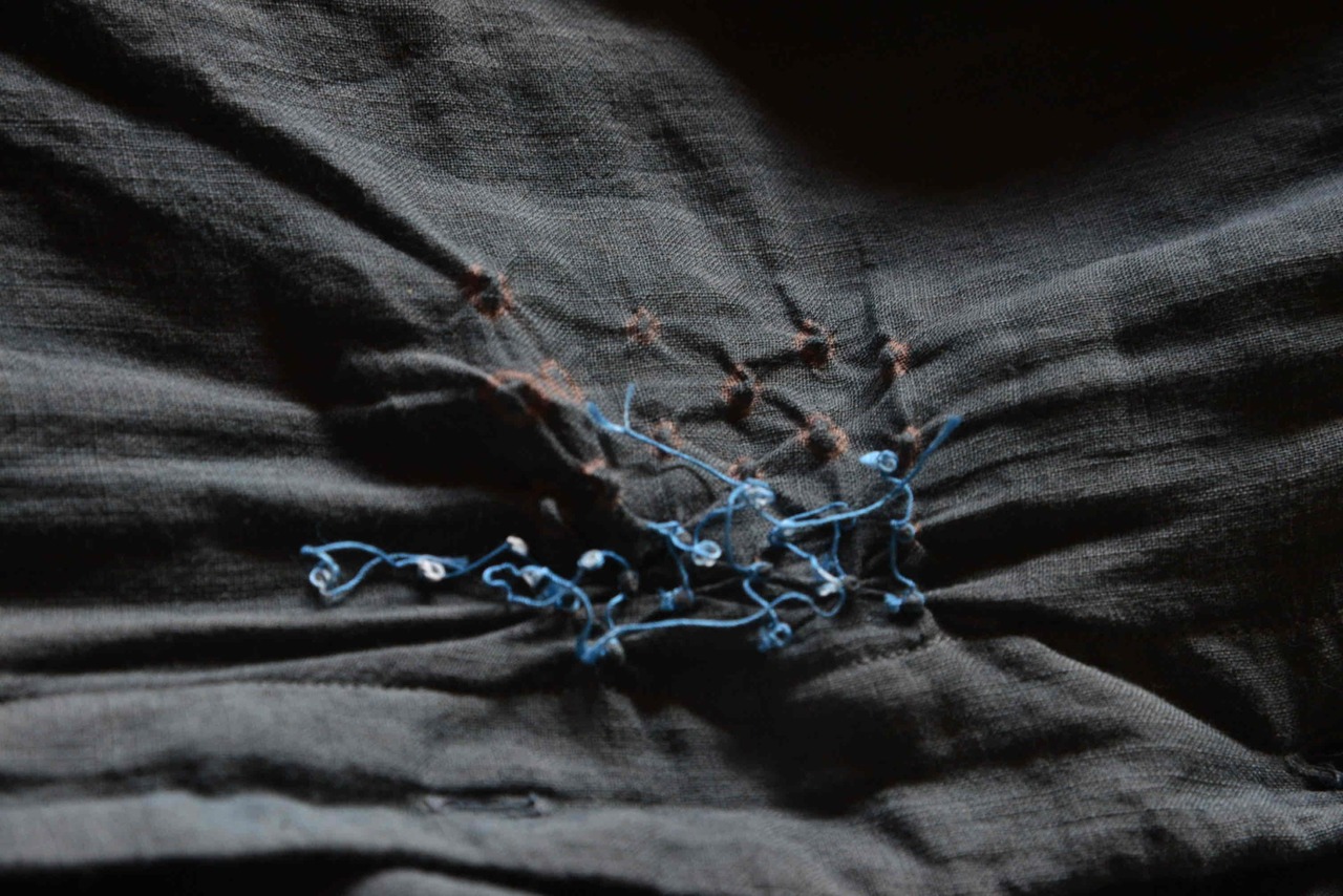 こちらはまず阿仙薬で染めてからその後藍染を重ねて模様をだす、とても沢山の工程を踏んで仕上がった一枚です。