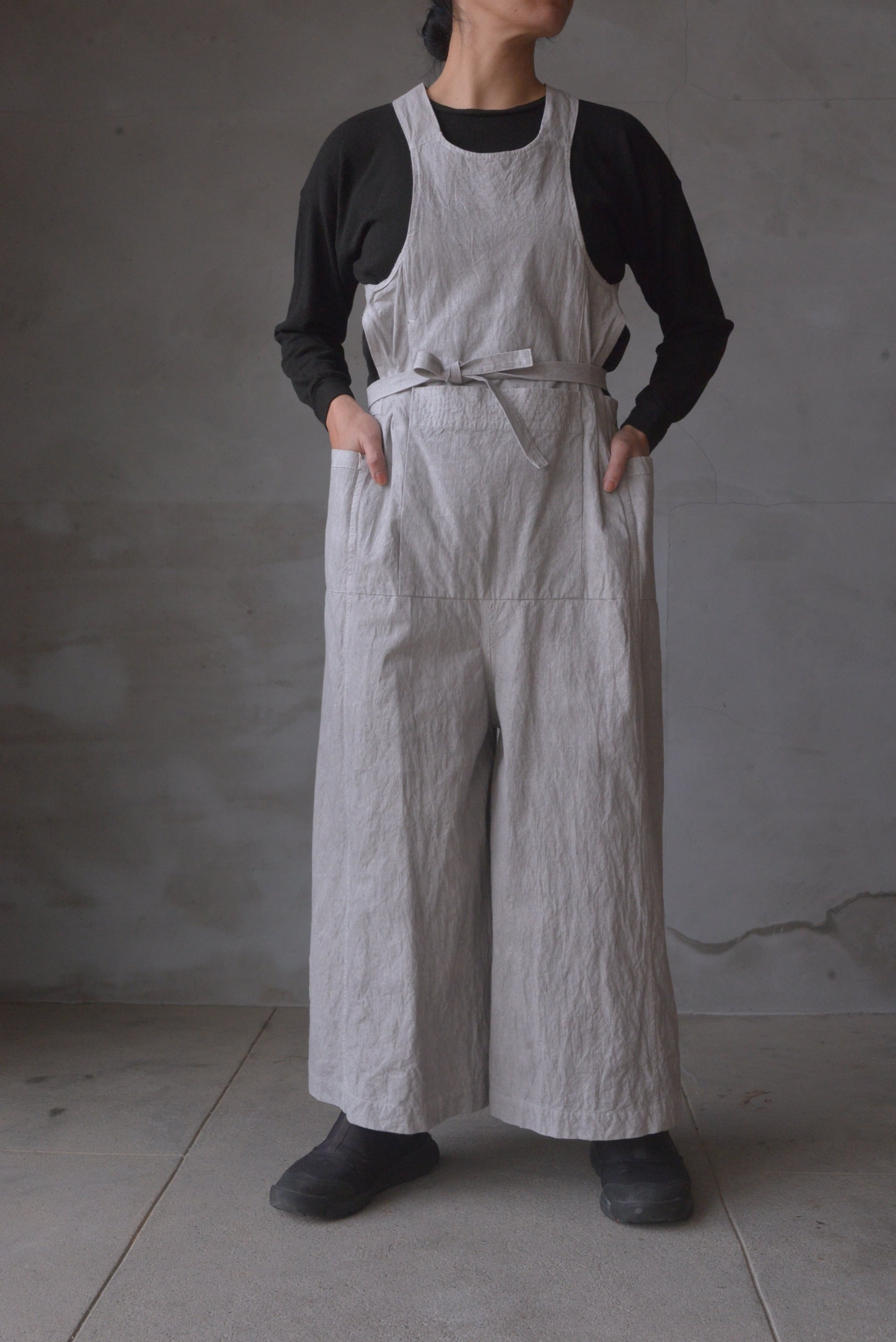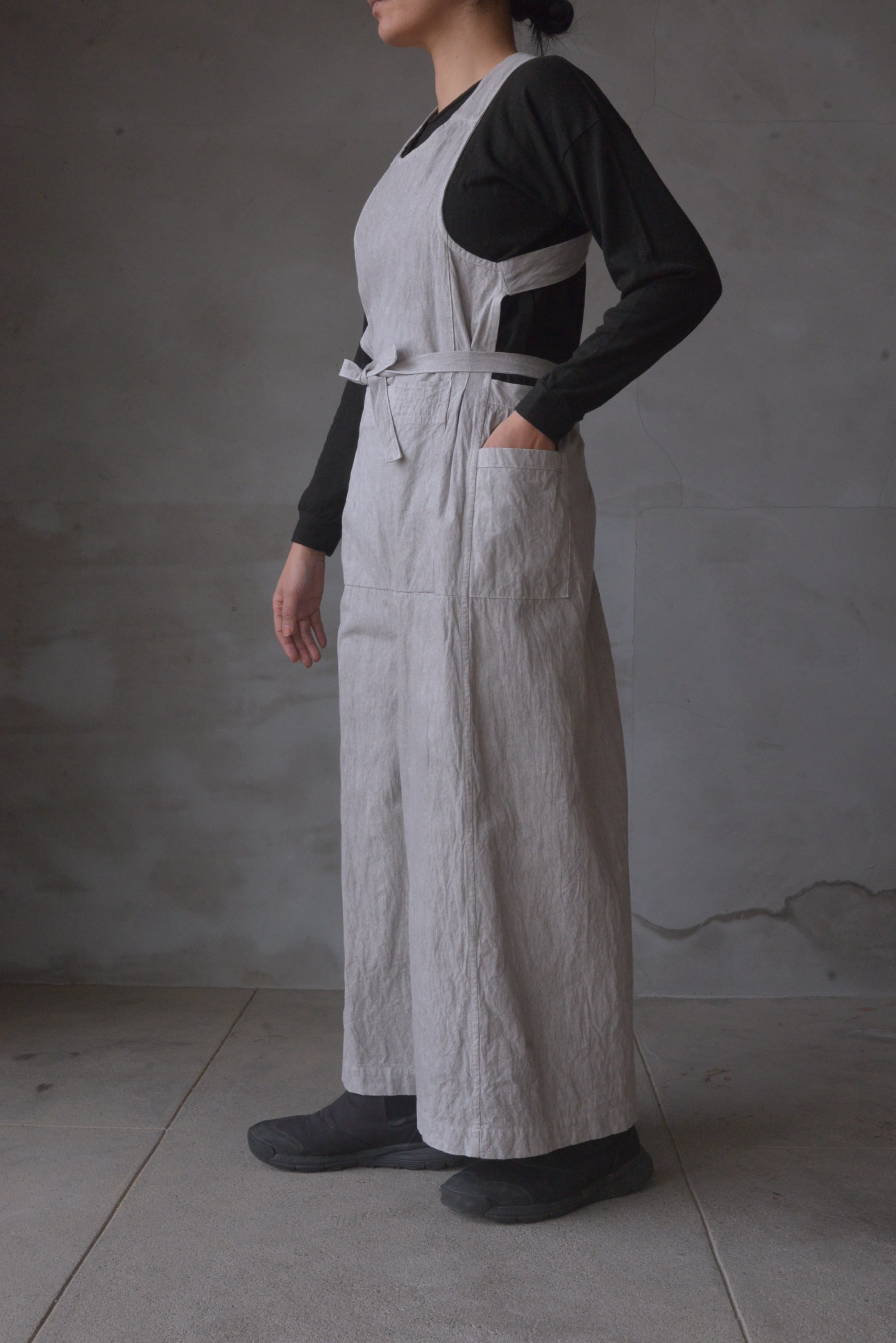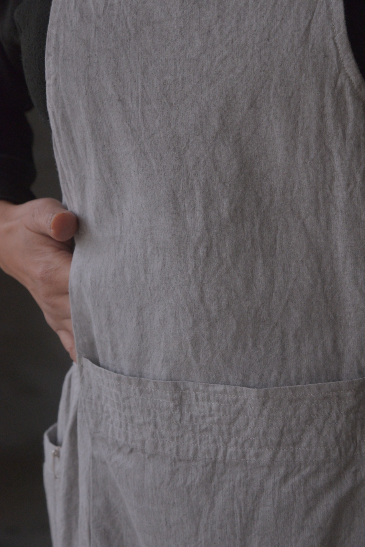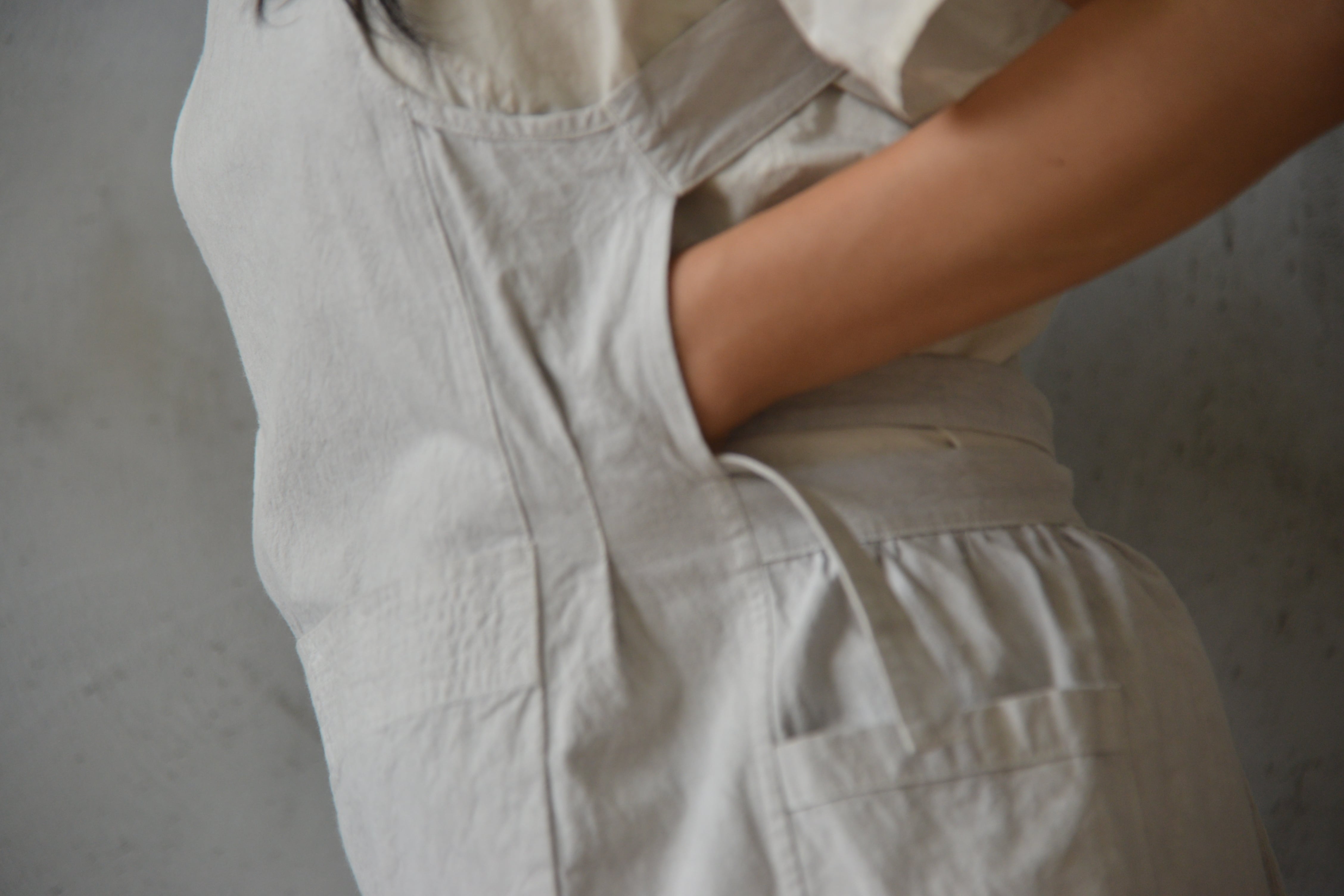 作業と日常の中間にあって、ワーク感とエレガントさも兼ねていて、作業中にそのまま出かけられる様な一枚になったらと思って作った1枚です。