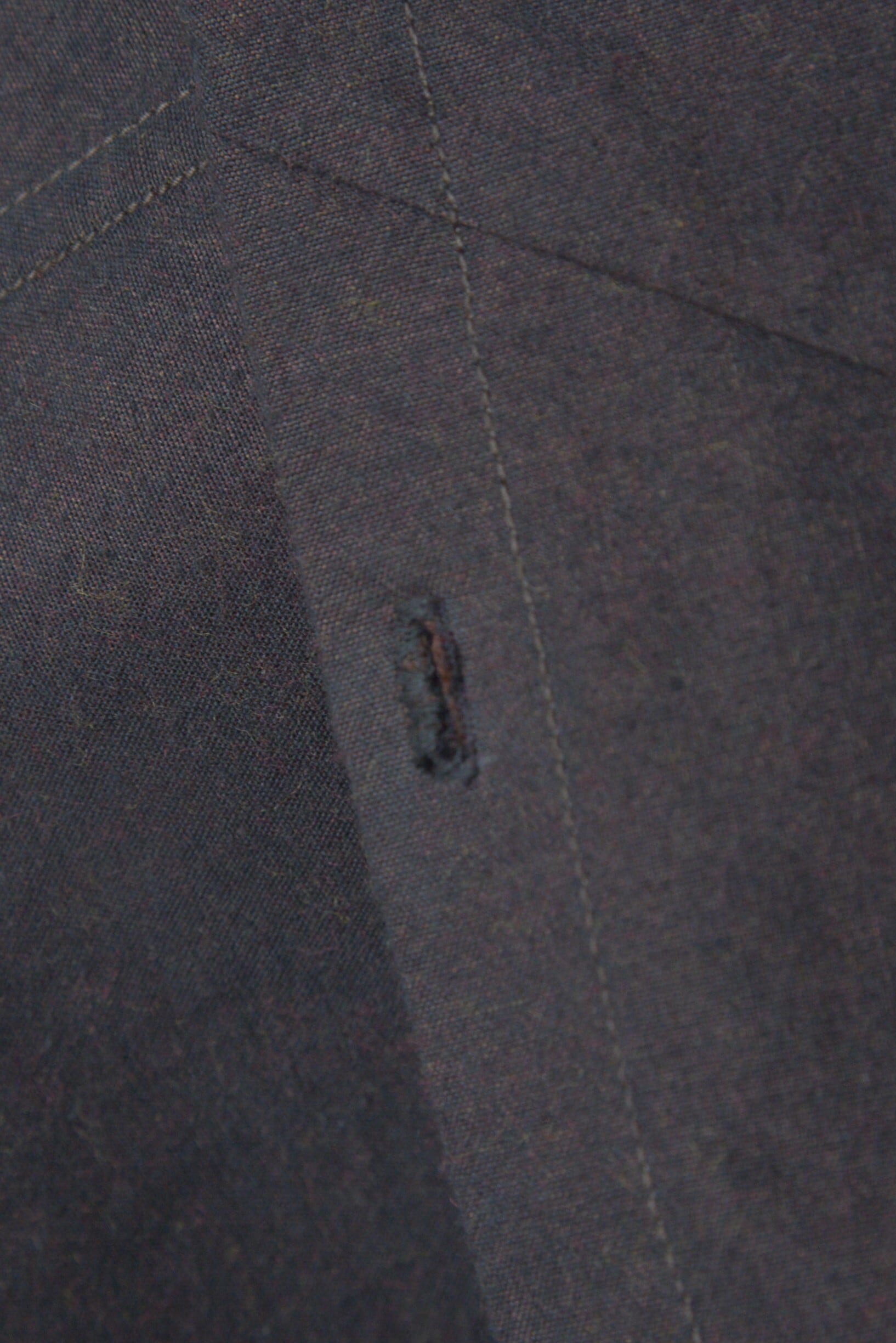 *生地の性質上、糸が滑りやすくボタンホールのミシンかがりが滑って外れてしまったため、手かがりで補修をしています。(写真最後)ご了承いただける方はご購入の検討をお願いします。