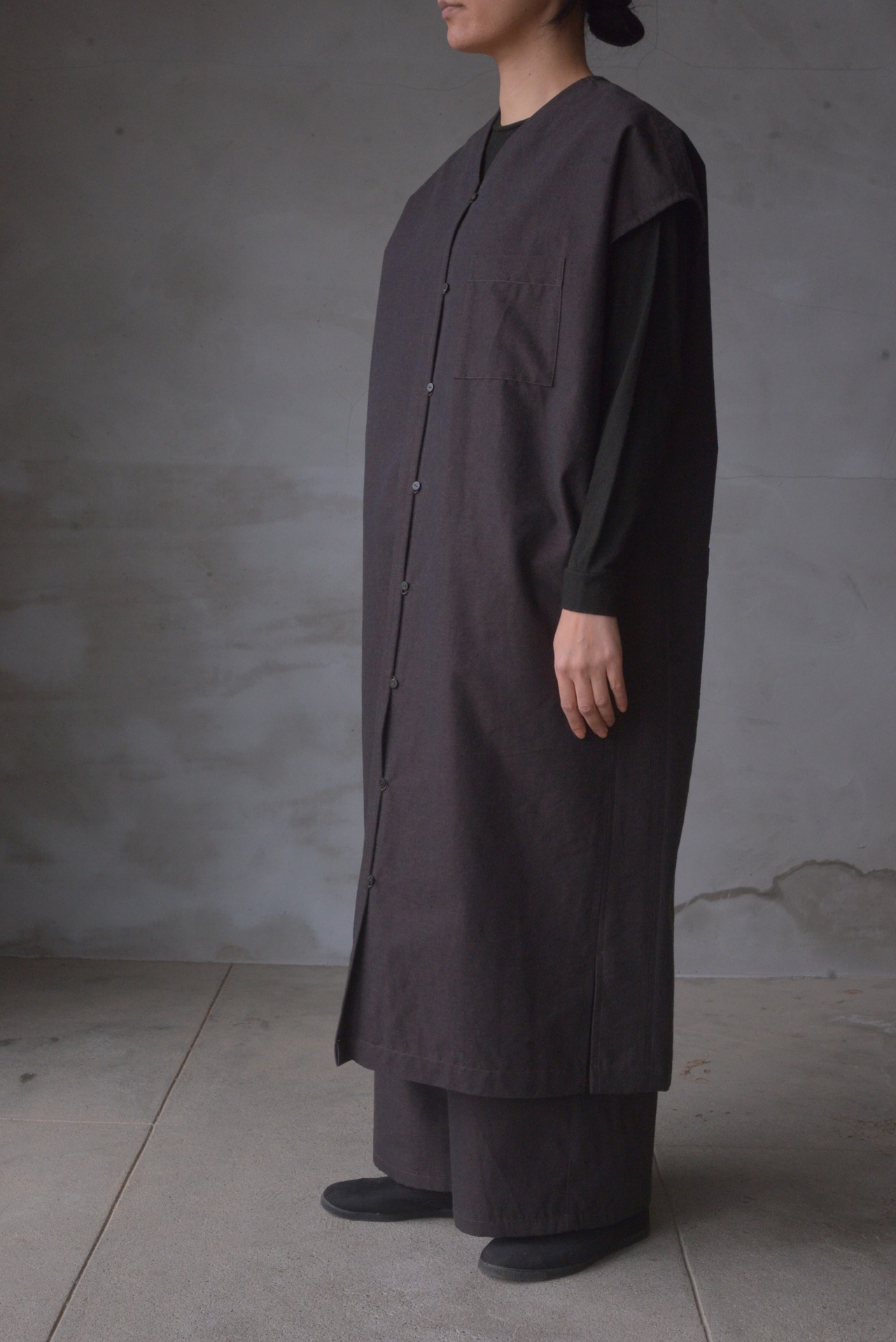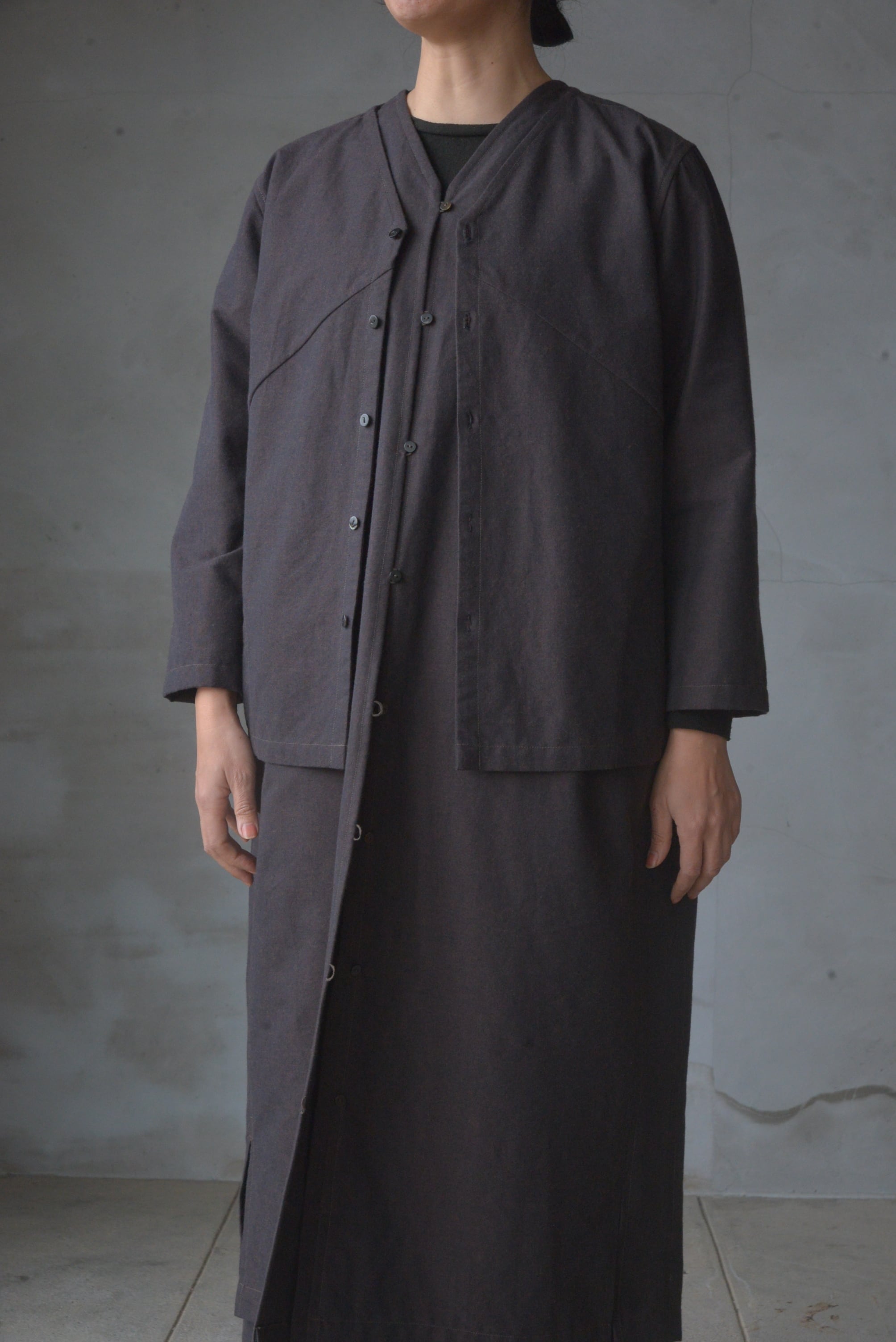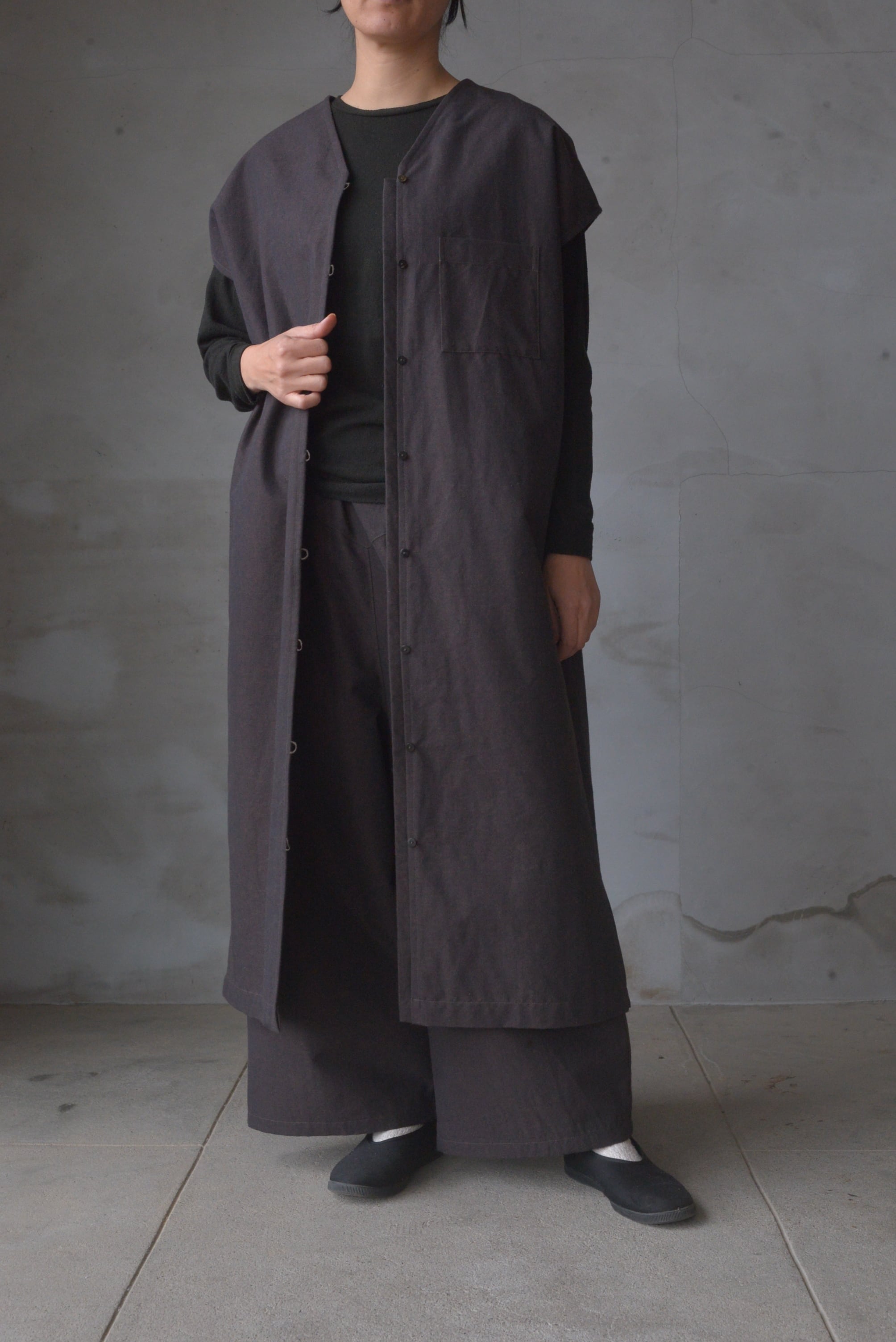 こちらは前がボタンと手かがりの糸ループで開けたり閉じたりして着られるため、ロングジレの様にも着ていただけます。