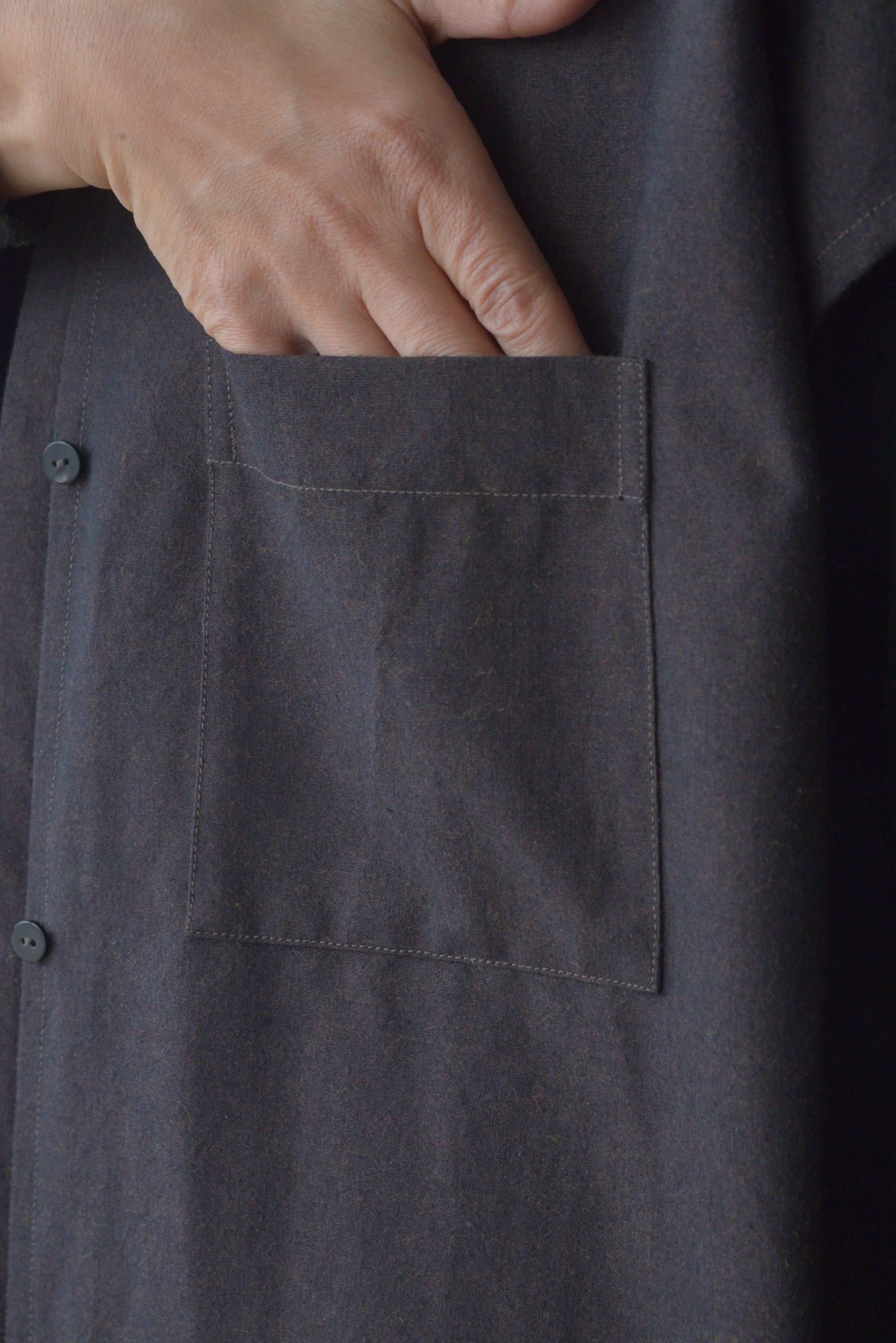 高密度なため風通しも少なく温かさもあるけれど、毛羽立ちがなくシャリ感があり吸湿放湿も優れているため盛夏以外の時期であれば通年で着ていただけます。