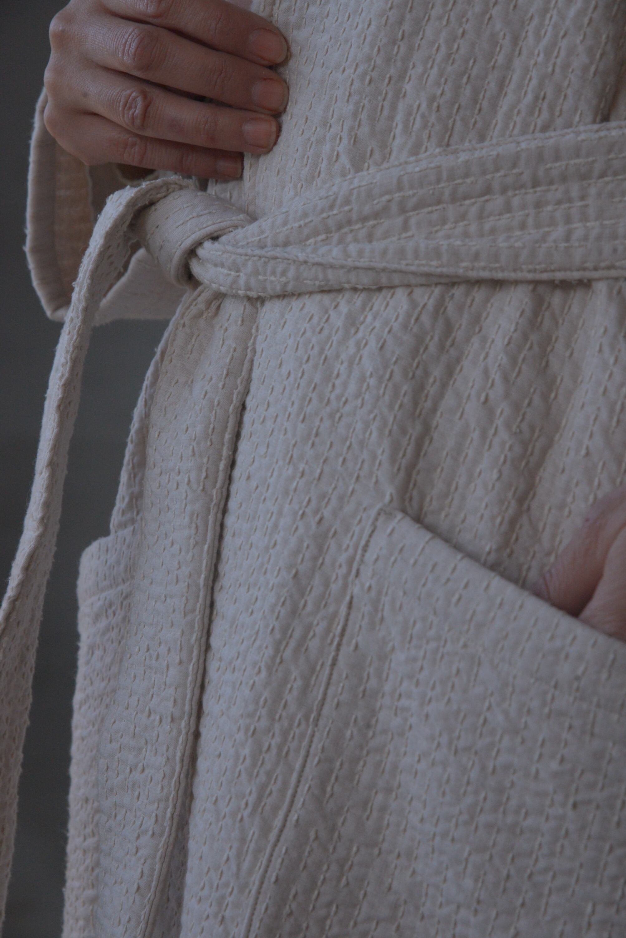 デザインは身幅や袖幅を大きく設定し、ゆとりをもたせたパターンとなっています。前端から裁ち続きの襟にかけて、生地の地の目を合わせることで、刺し子織りの表情が生きています。両側に大きなポケットが付き、別途生地耳を生かした紐が付きます。