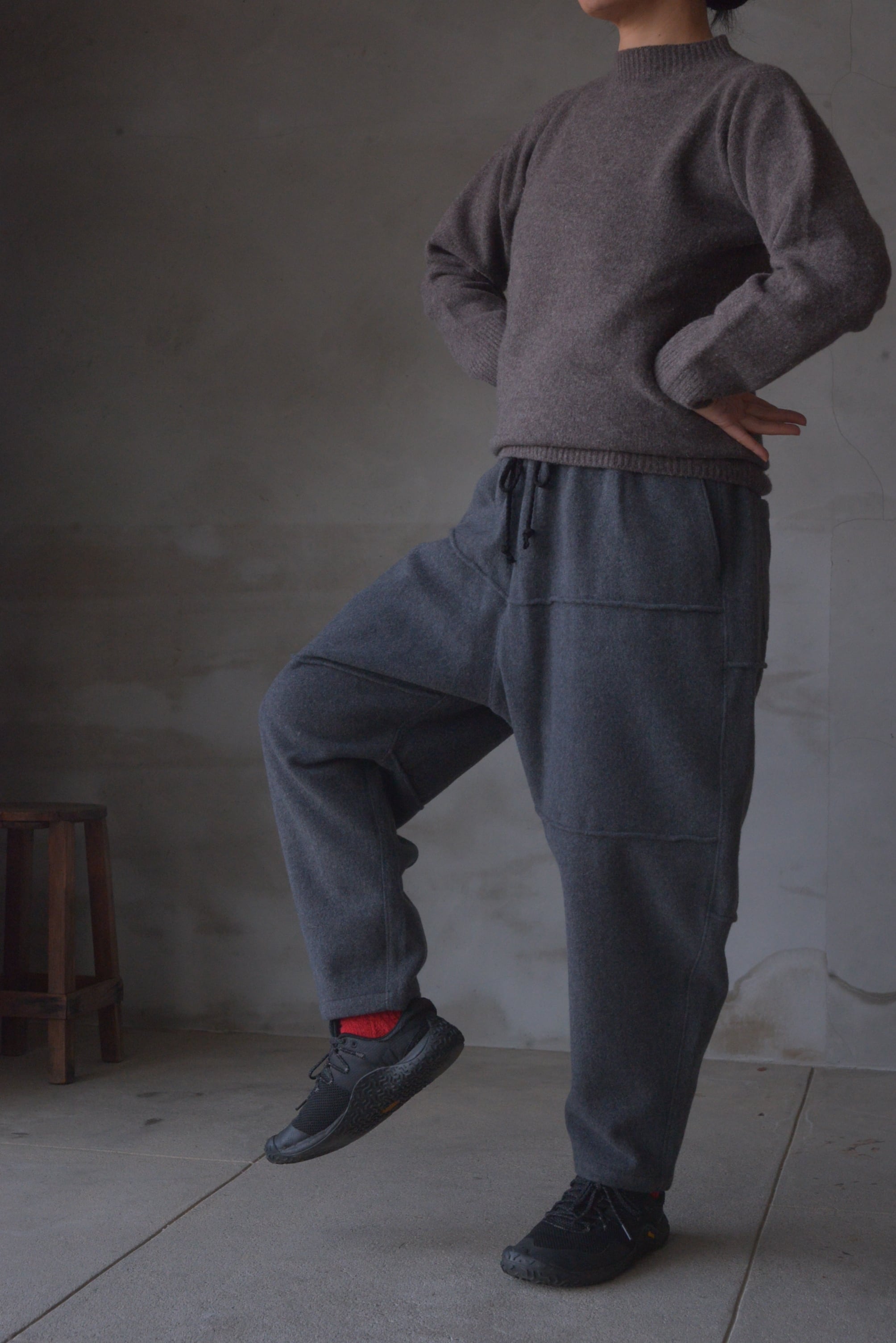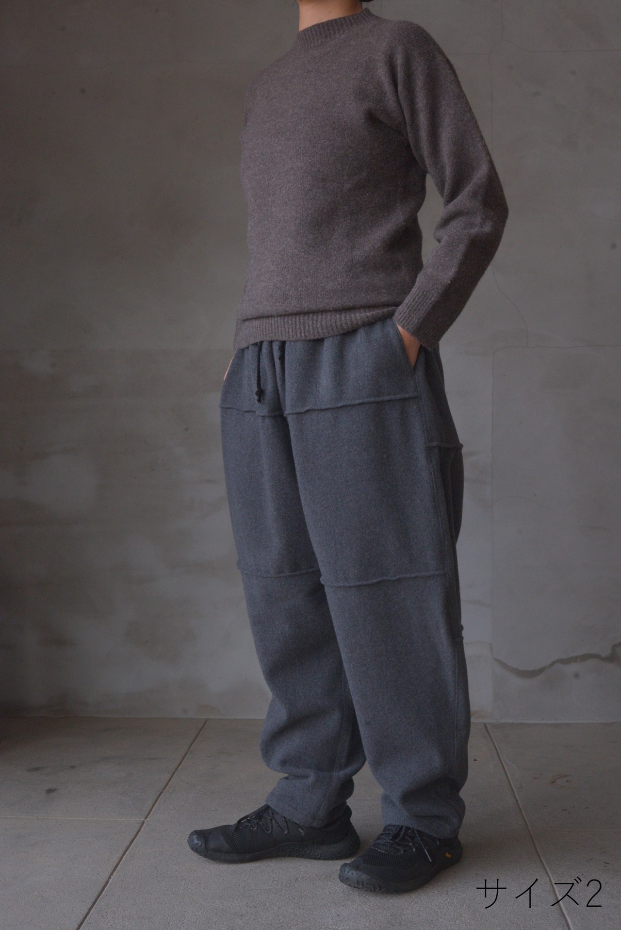 厚みがありやわらかなウール生地で、ゴムと紐のウエストを調整できる仕様はリラックスもできて質のよいウールの品もあり毎日の冬のパンツにぴったりです。