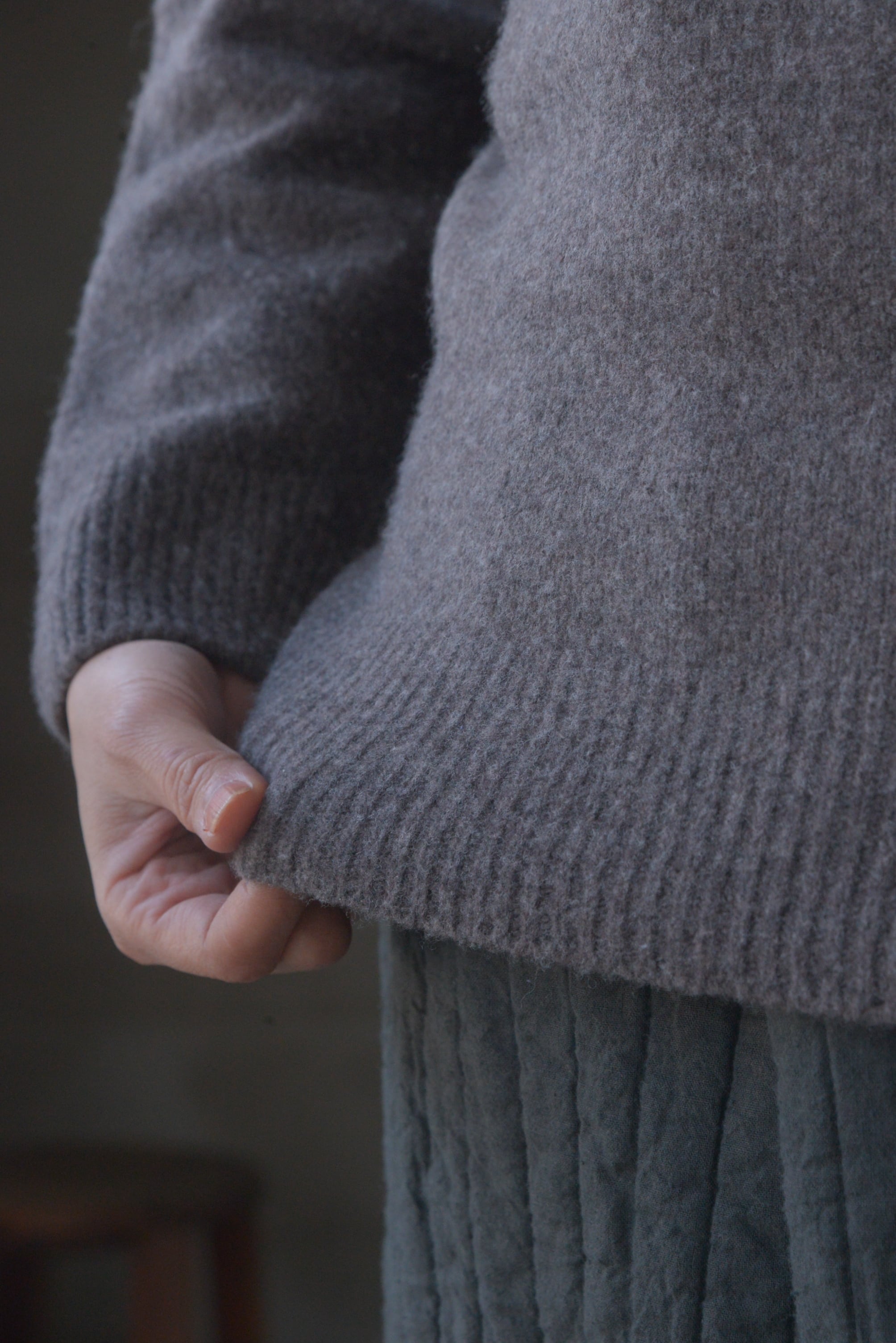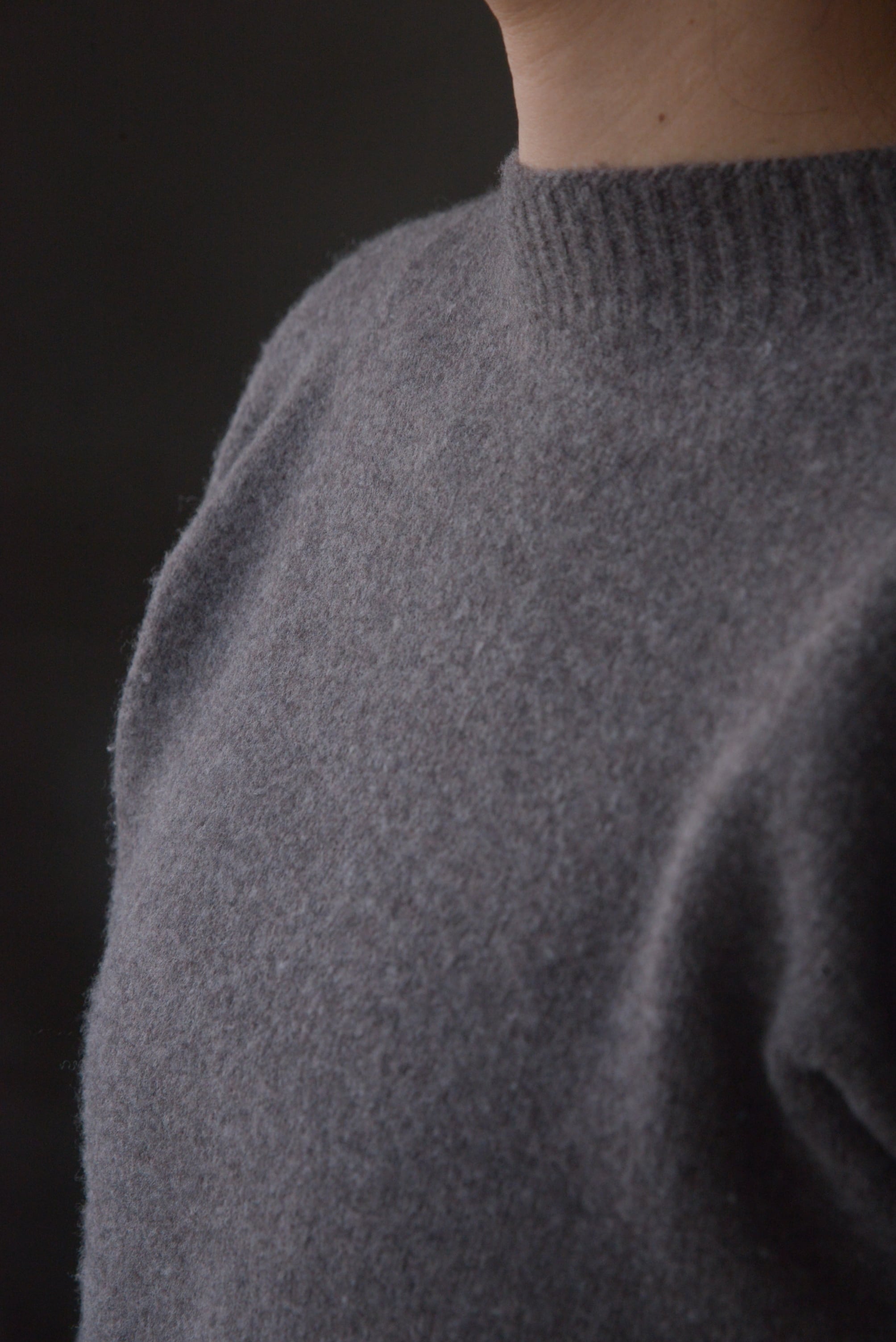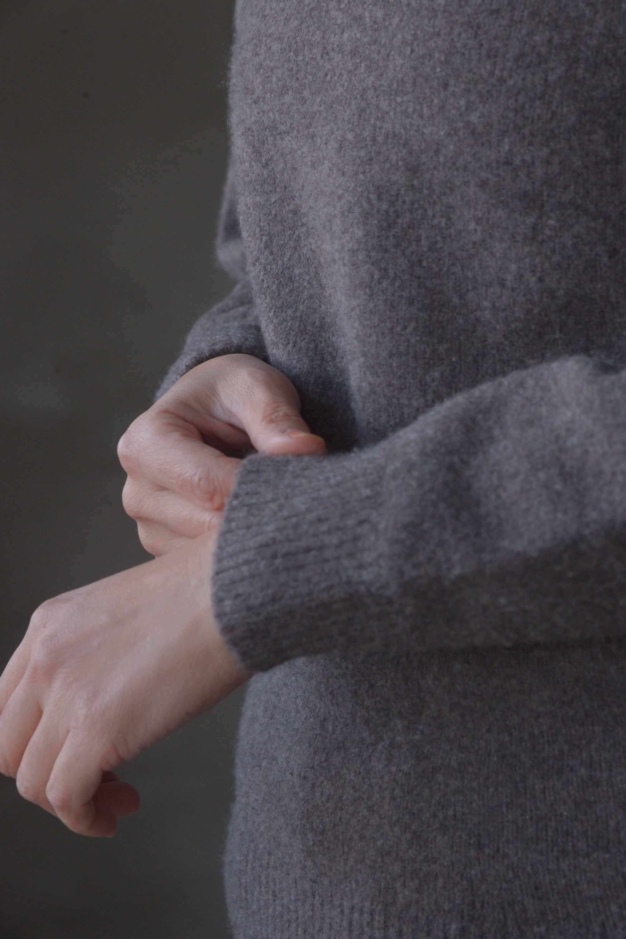 滑らかでありながら嵩高性があり、カシミヤに近い肌触りで、糸を2本取りにすることで、適度なボリュームが生まれたミドルゲージのニットになります。原料を大阪は泉州の紡績工場、深喜毛織さんが紡績しています。