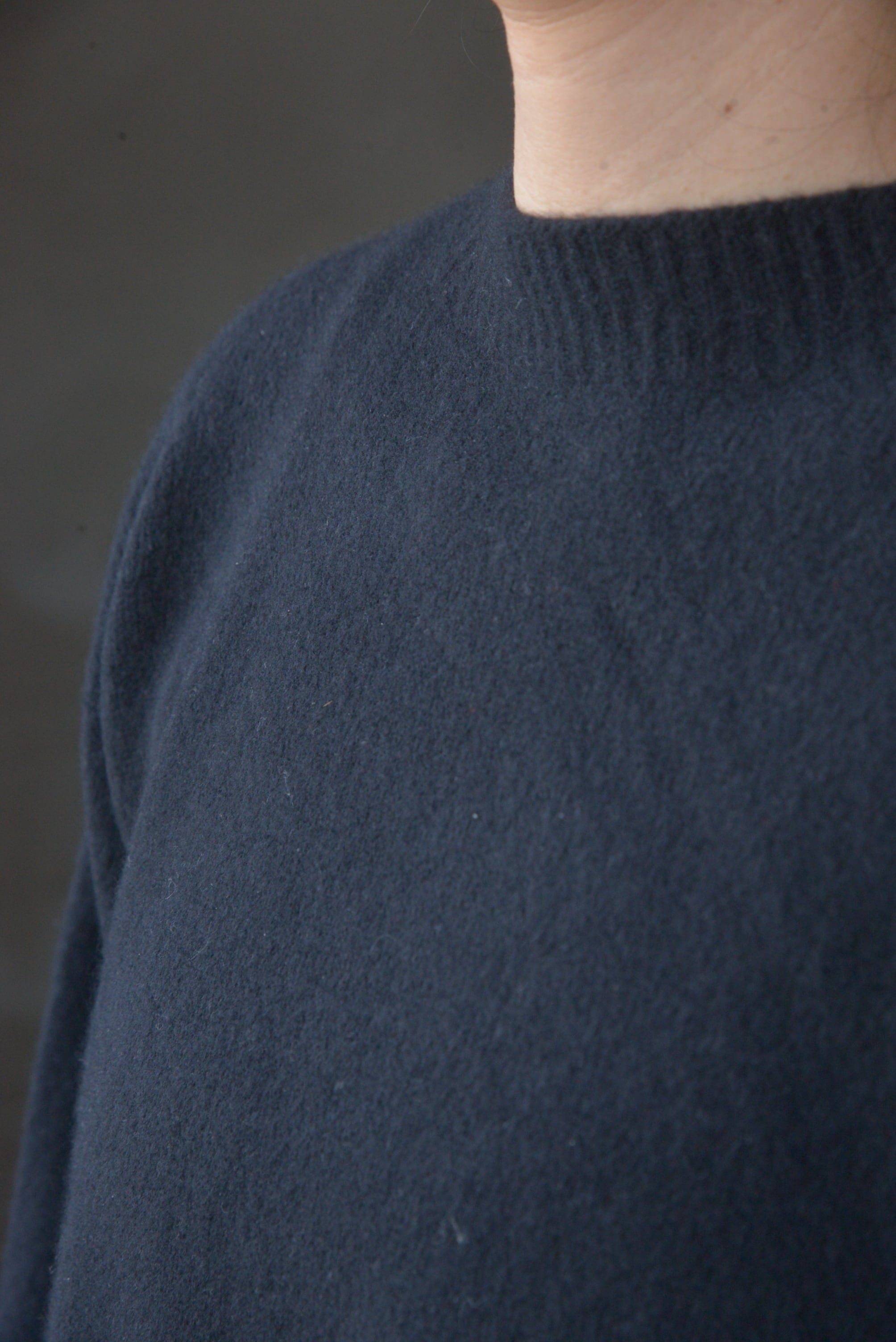 滑らかでありながら嵩高性があり、カシミヤに近い肌触りで、糸を2本取りにすることで、適度なボリュームが生まれたミドルゲージのニットになります。原料を大阪は泉州の紡績工場、深喜毛織さんが紡績しています。