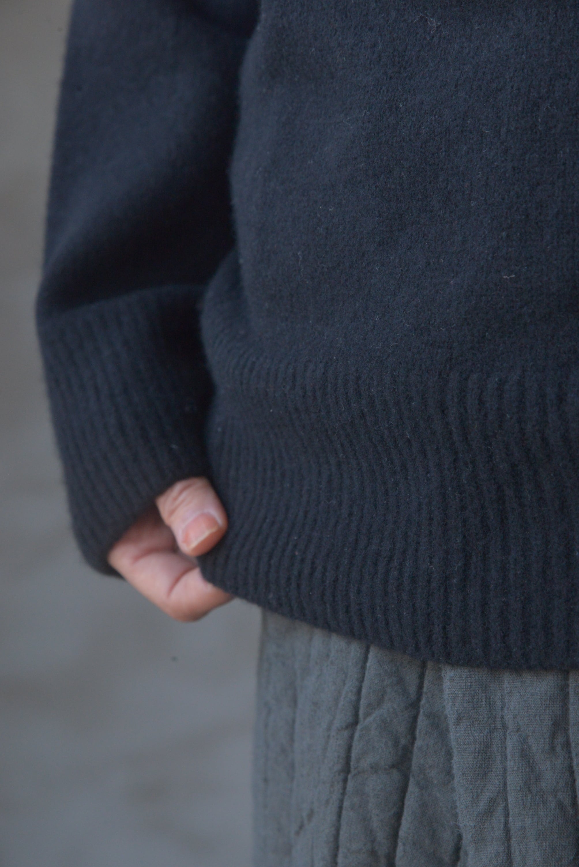 極細のウールの糸を使いホールガーメントで編み立てた後、圧縮させたとても暖かな一枚です。