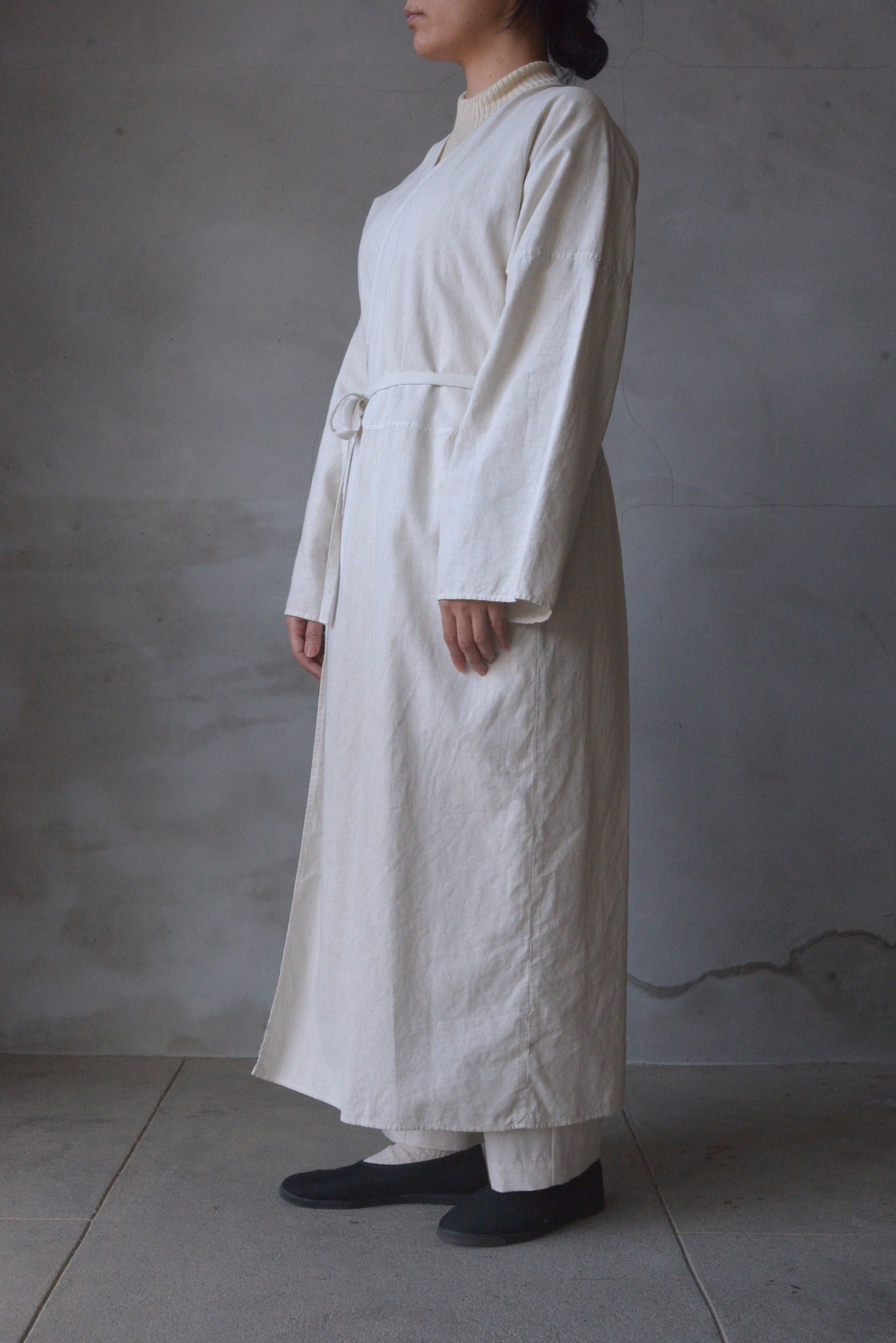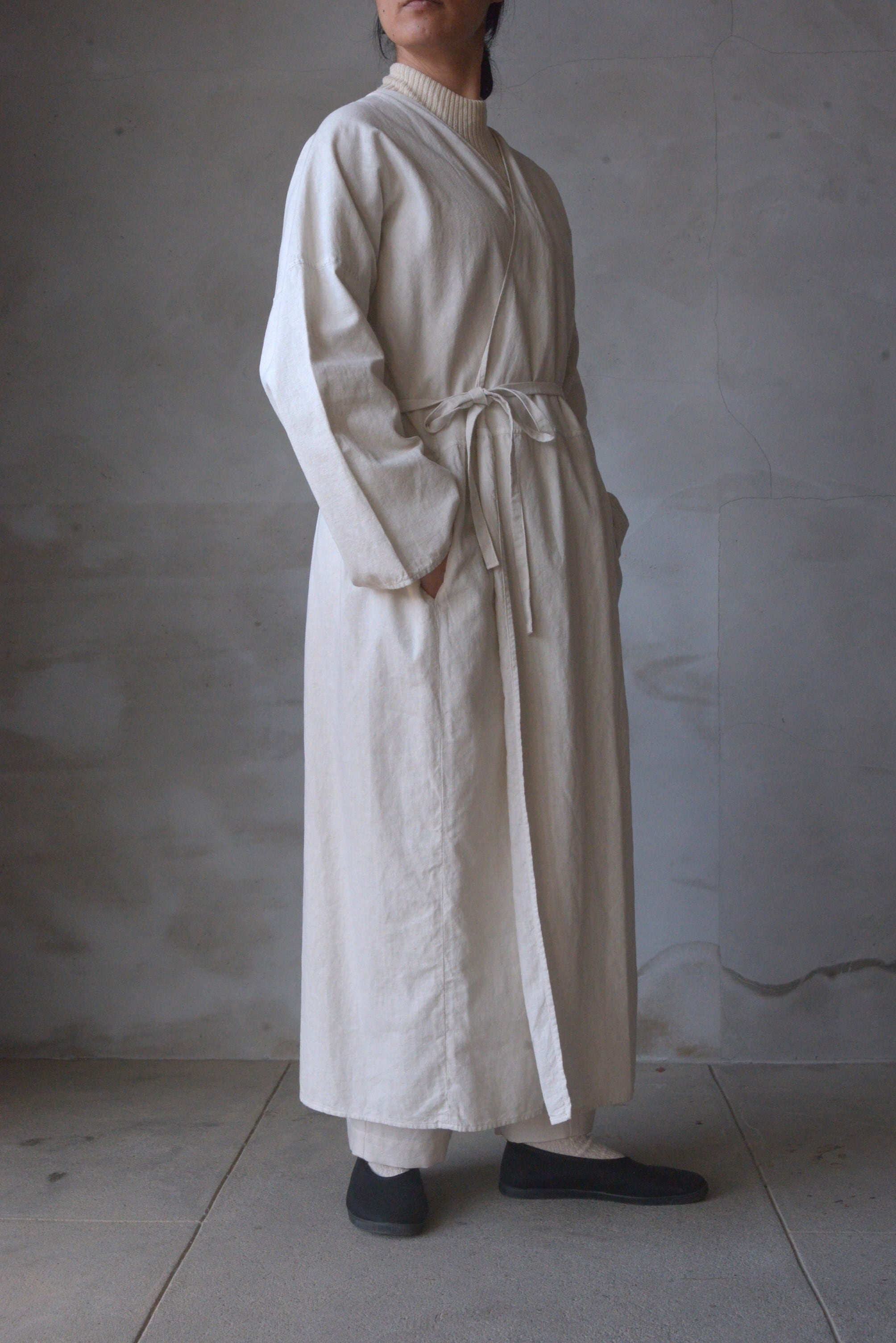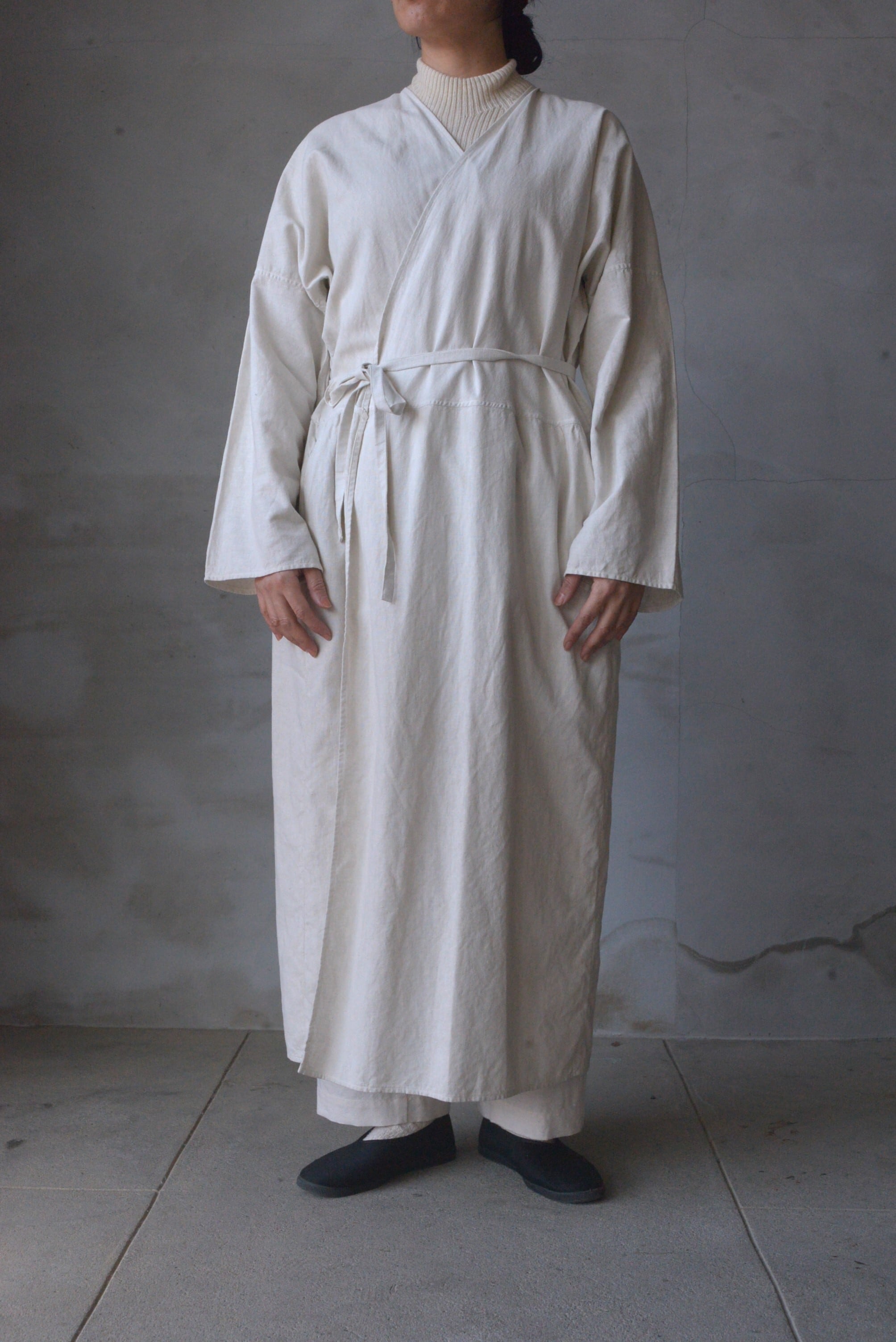 パターンは元々着物の反物でも作れるように、襟ぐりと脇のカーブ以外をほぼ直線で構成し、袖と下身頃、マチに至っては完全な長方形となっています。着物のように平面的な構造ですが、身体を入れることで立体的になり、バイアスになった上身頃と背面のギャザーが自然と身体に馴染みます。また、前面を開けて着ることも可能です。両脇にポケットが付き、別途腰紐が付きます。