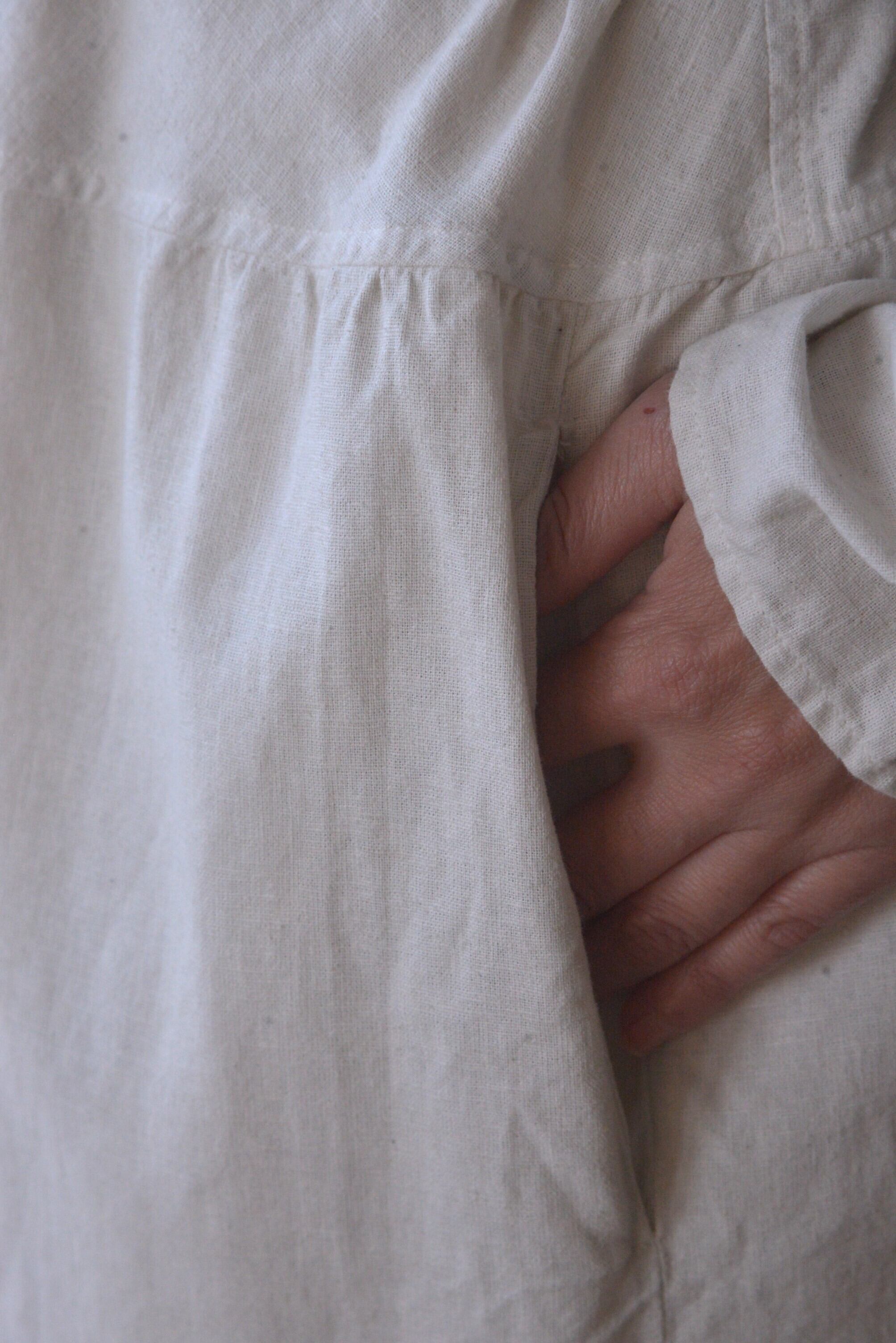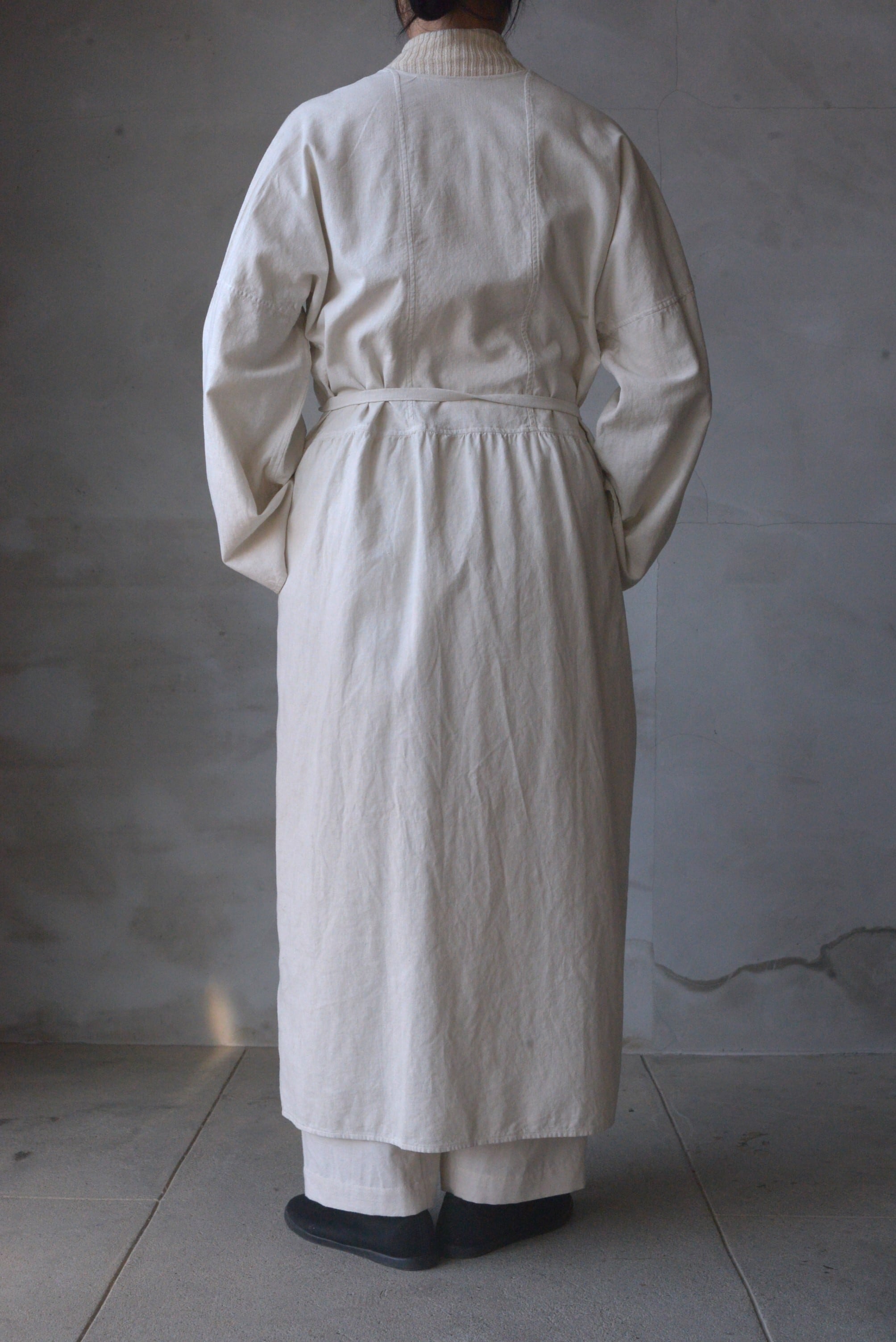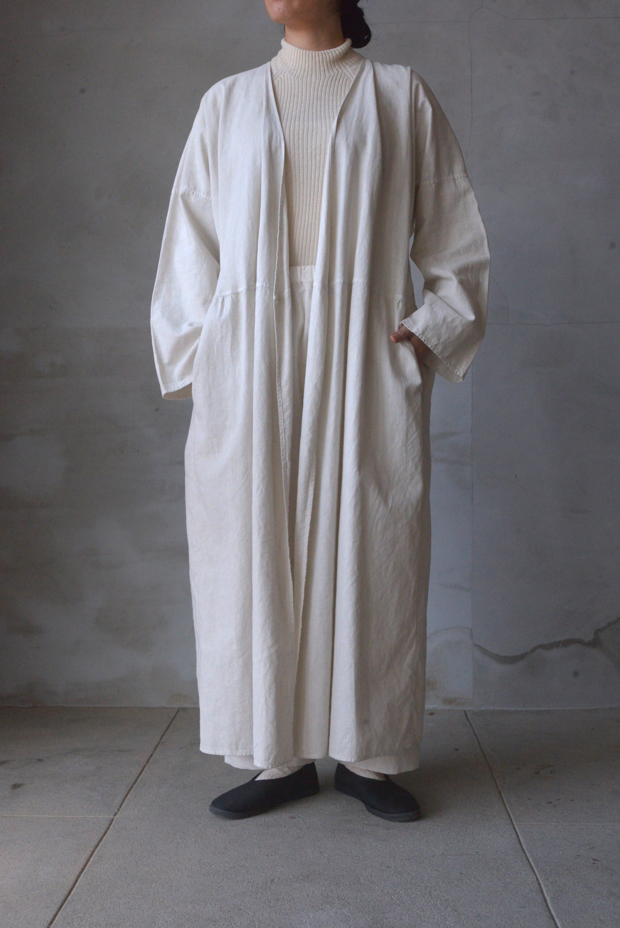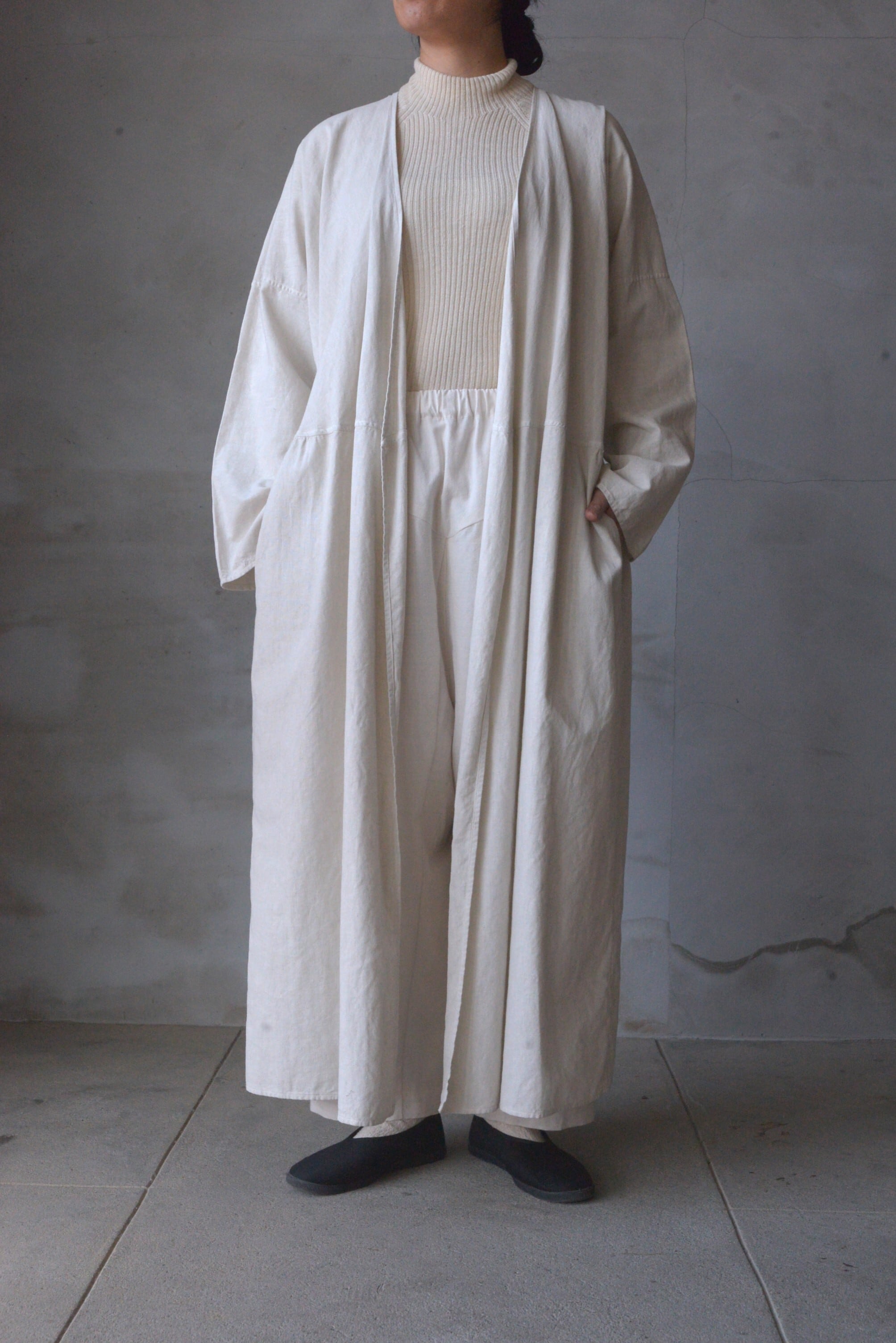パターンは元々着物の反物でも作れるように、襟ぐりと脇のカーブ以外をほぼ直線で構成し、袖と下身頃、マチに至っては完全な長方形となっています。着物のように平面的な構造ですが、身体を入れることで立体的になり、バイアスになった上身頃と背面のギャザーが自然と身体に馴染みます。また、前面を開けて着ることも可能です。両脇にポケットが付き、別途腰紐が付きます。