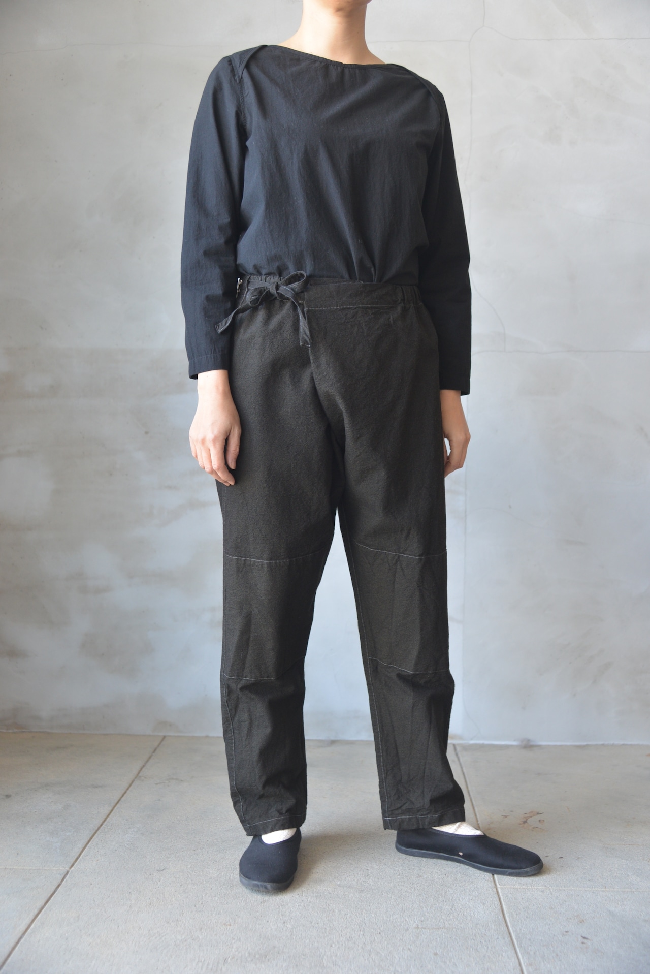 日本の伝統的な野良着のもんぺからの発想とパターン展開で作られた重ねもんぺパンツ。