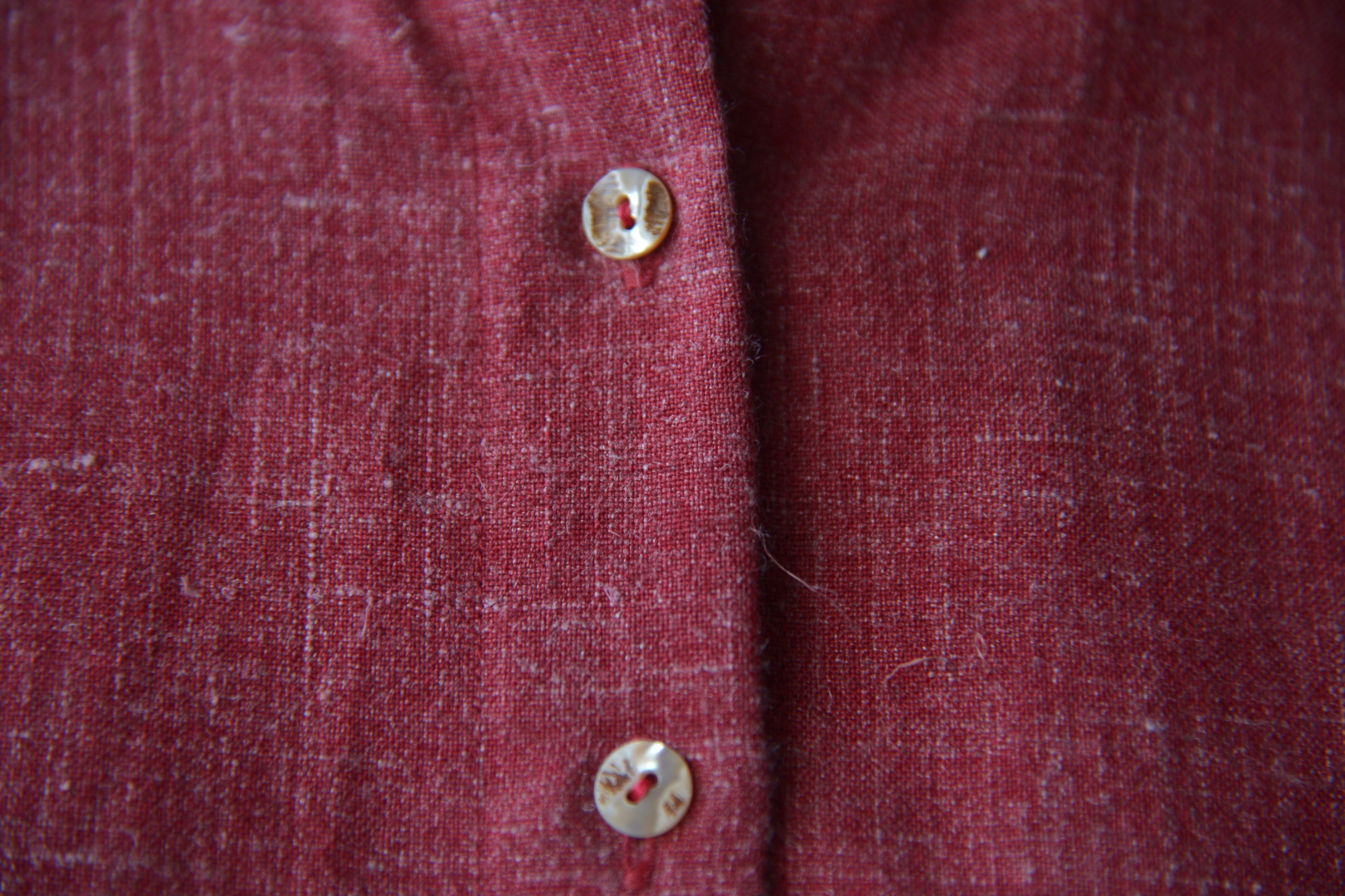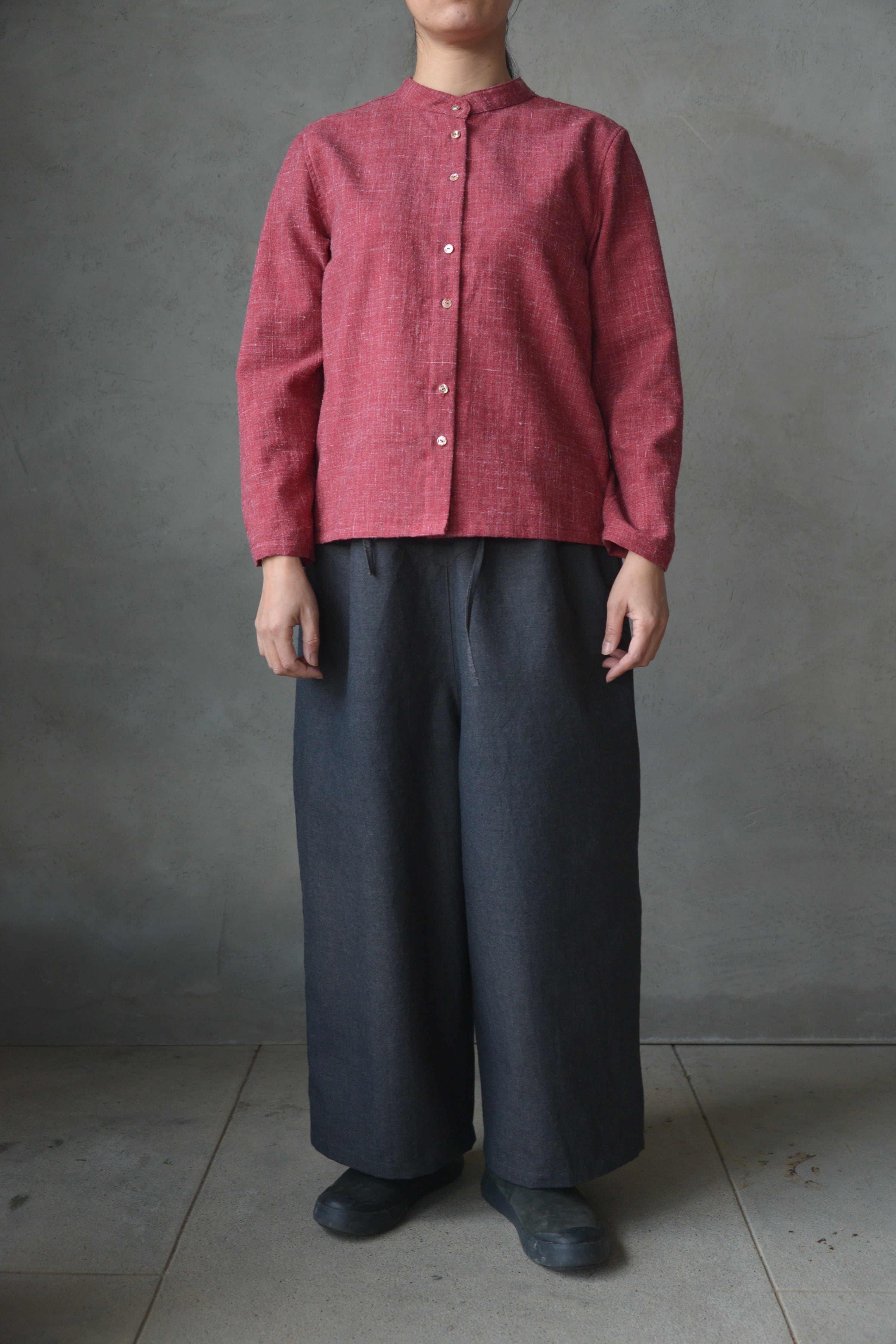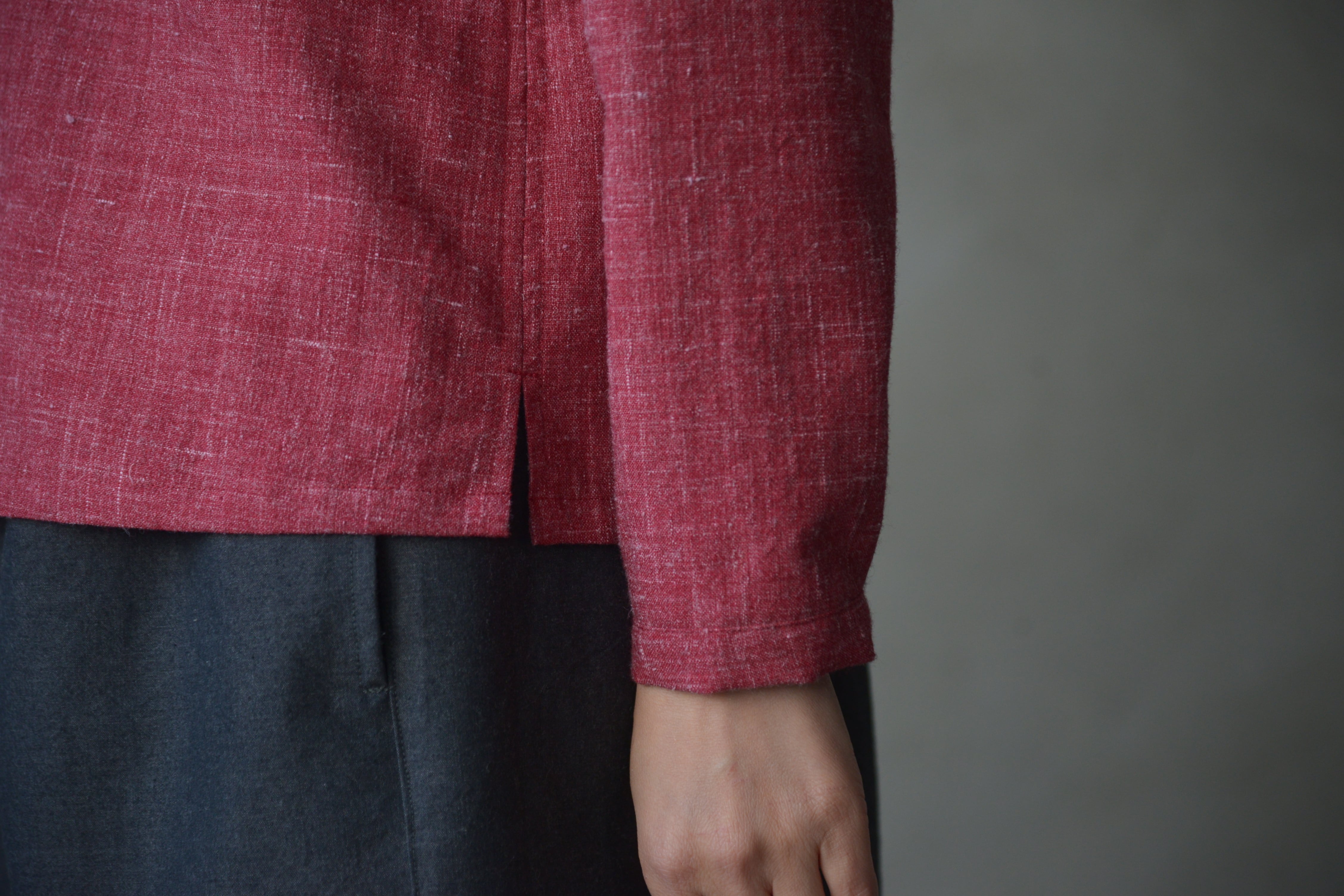 生地は、酸性染料で染まった赤いウールの糸と、染まっていない生成りのヘンプの糸が経緯に入り、アクセントになって表情をつくっています。