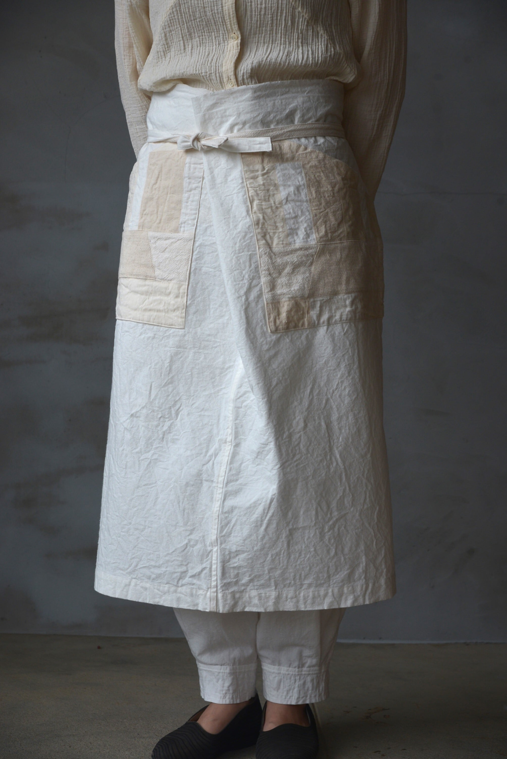 ワーク感のあるポケットを様々な端切れを継いで仕上げています。