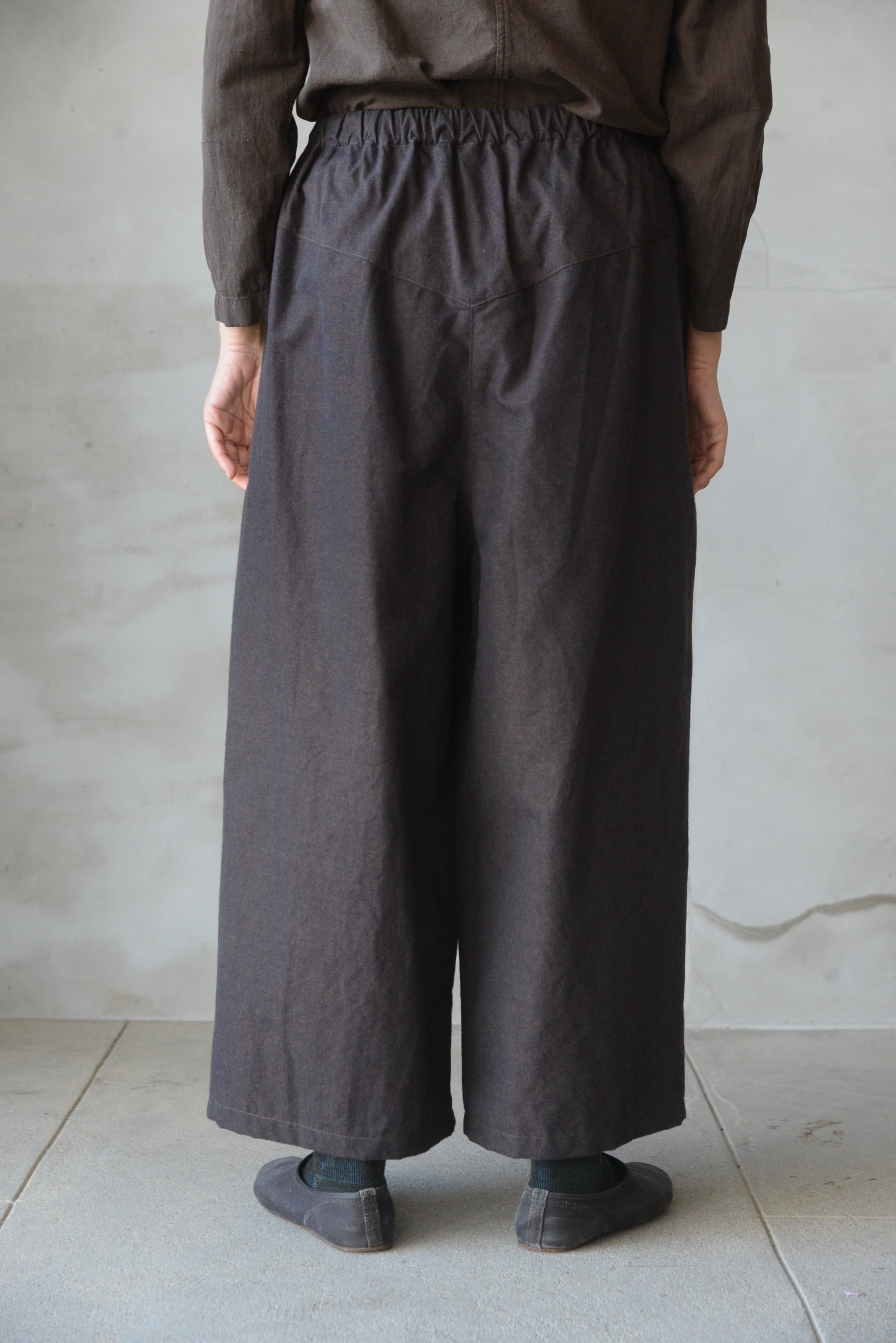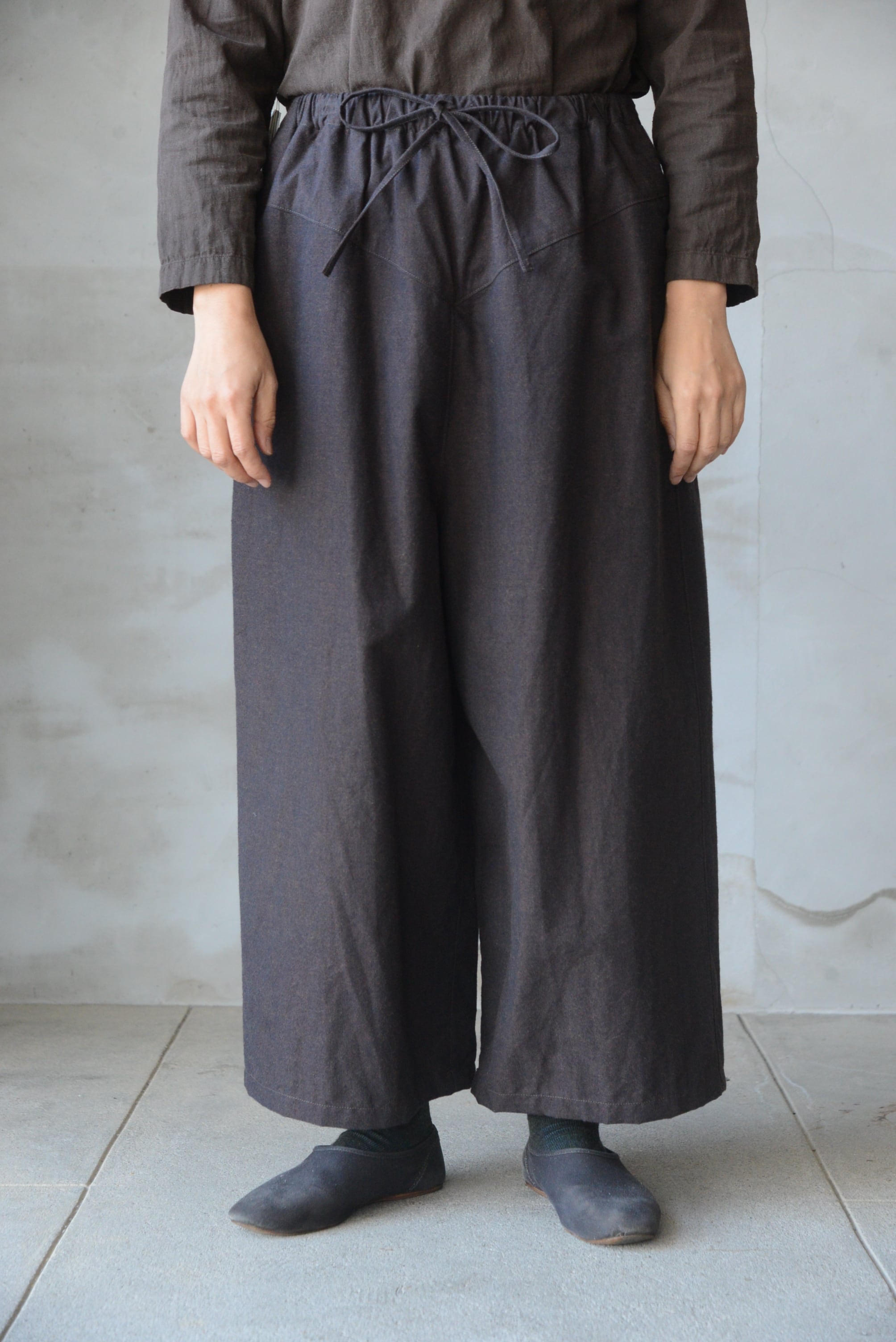 ウエストはゴムと表に紐が出る仕様で綺麗な印象もありながらリラックスして着られます。