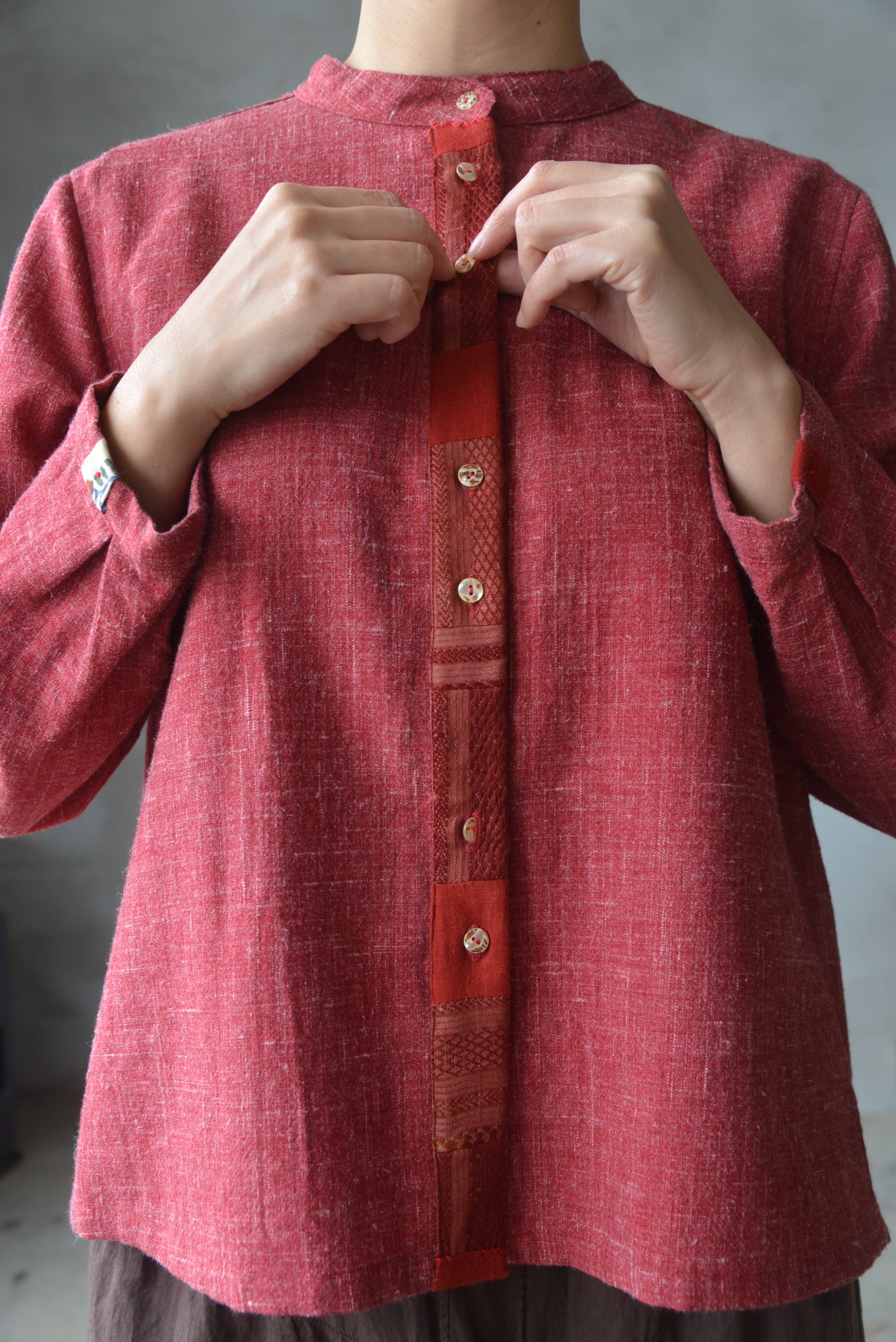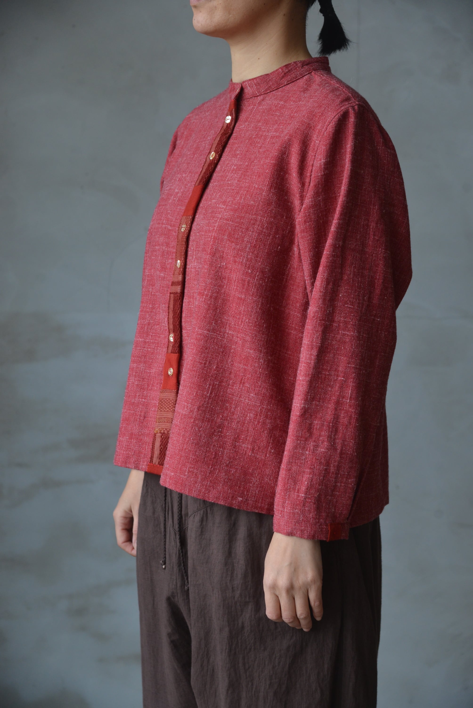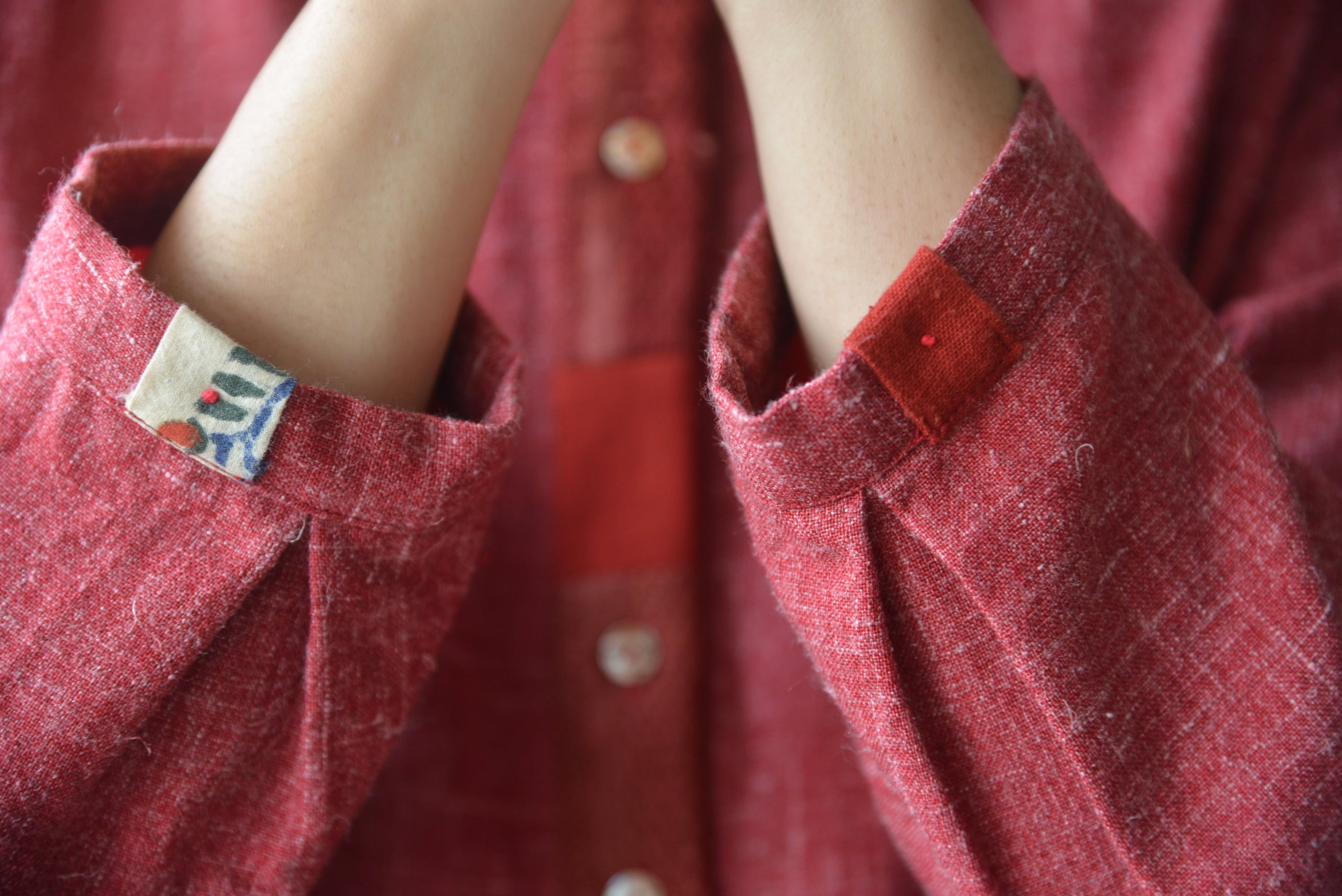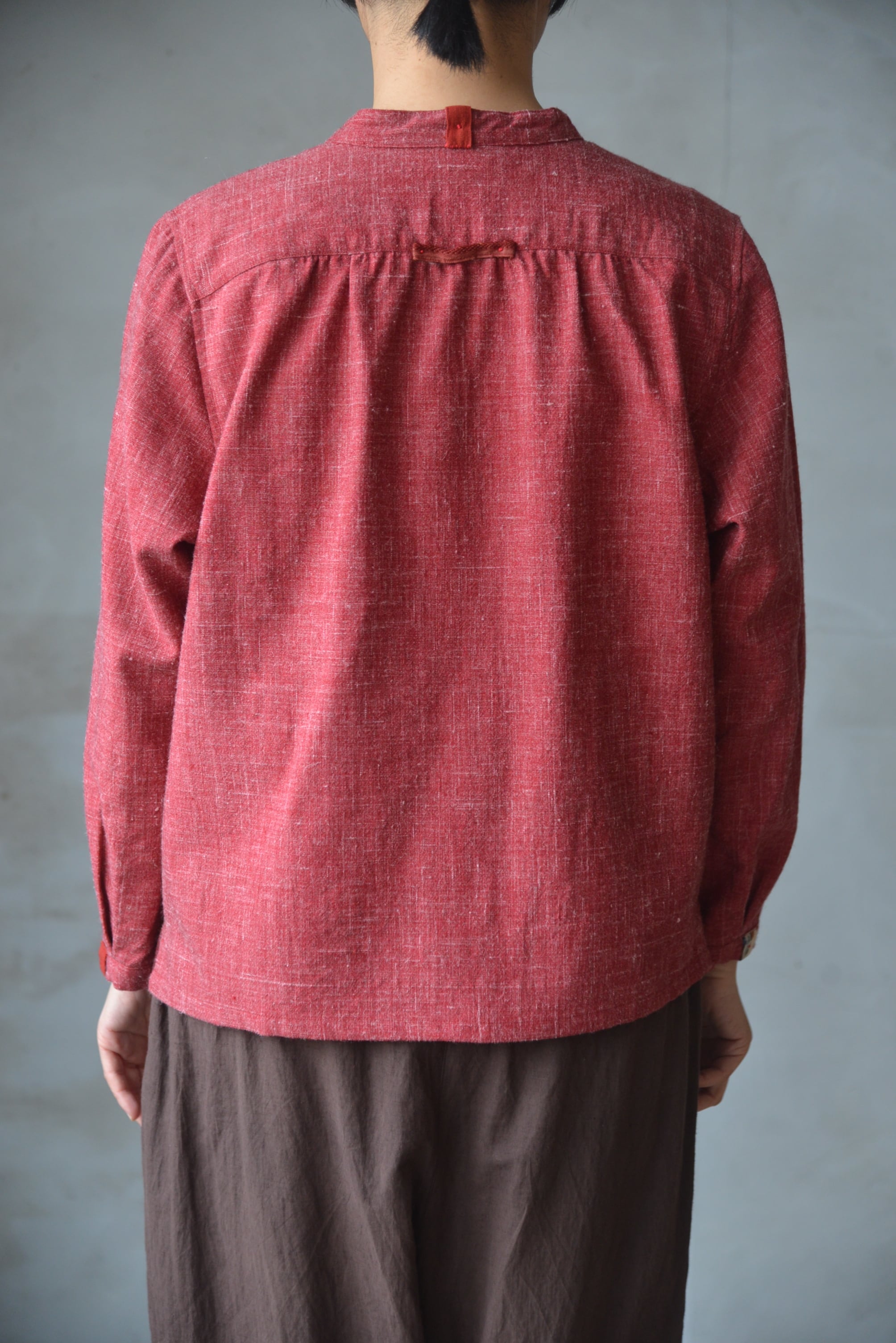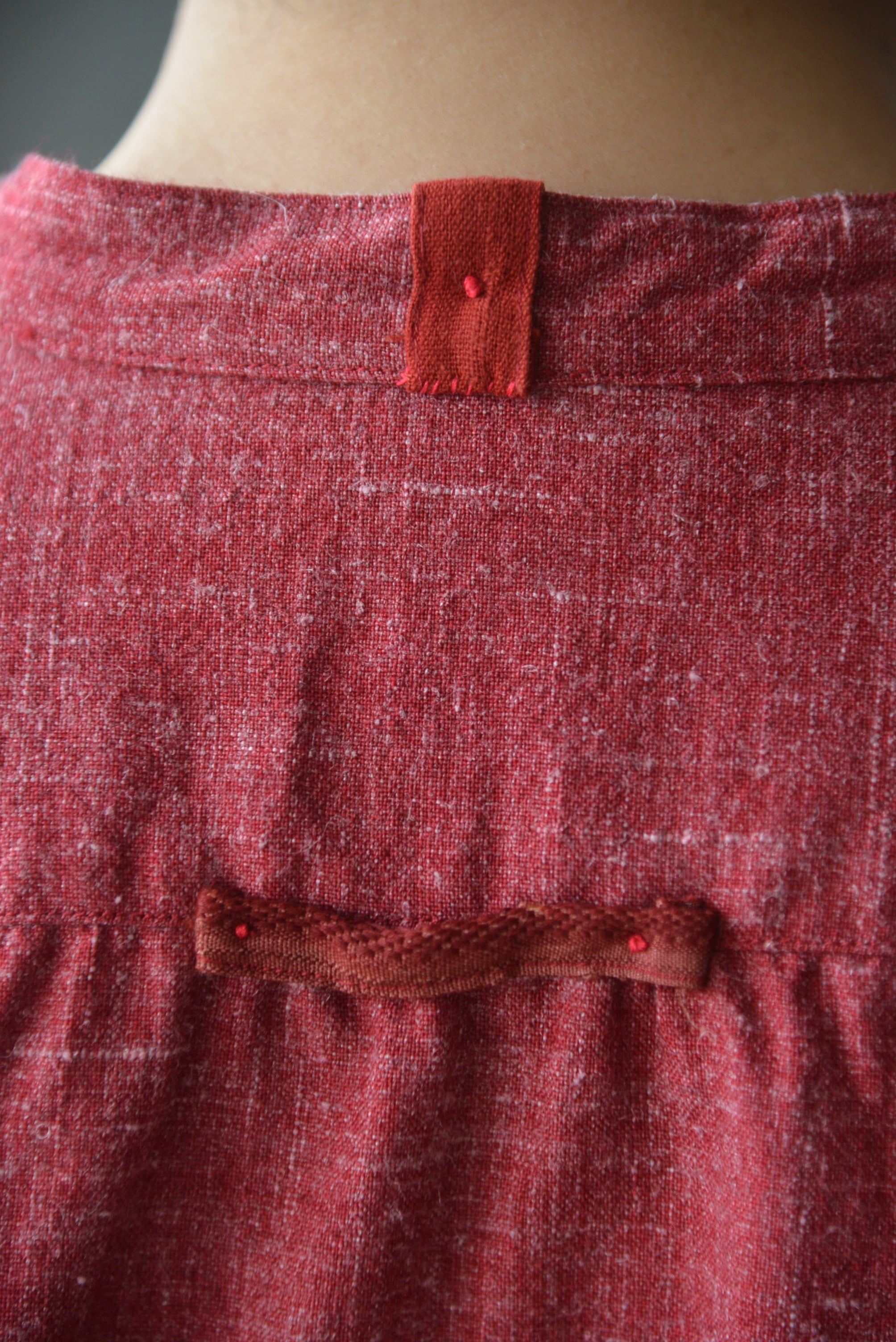 生地は、酸性染料で染まった赤いウールの糸と、染まっていない生成りのヘンプの糸が経緯に入り、アクセントになって表情をつくっています。