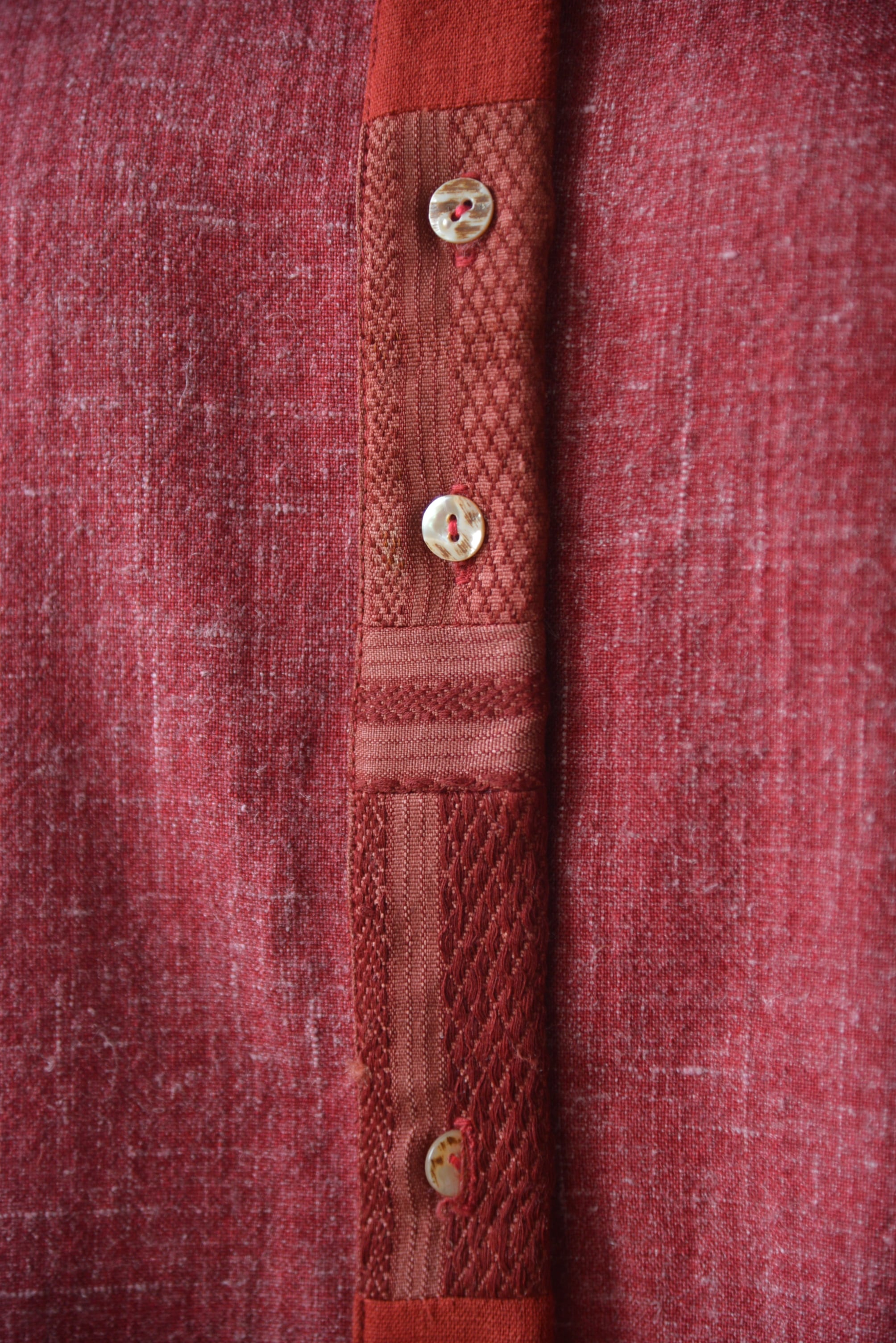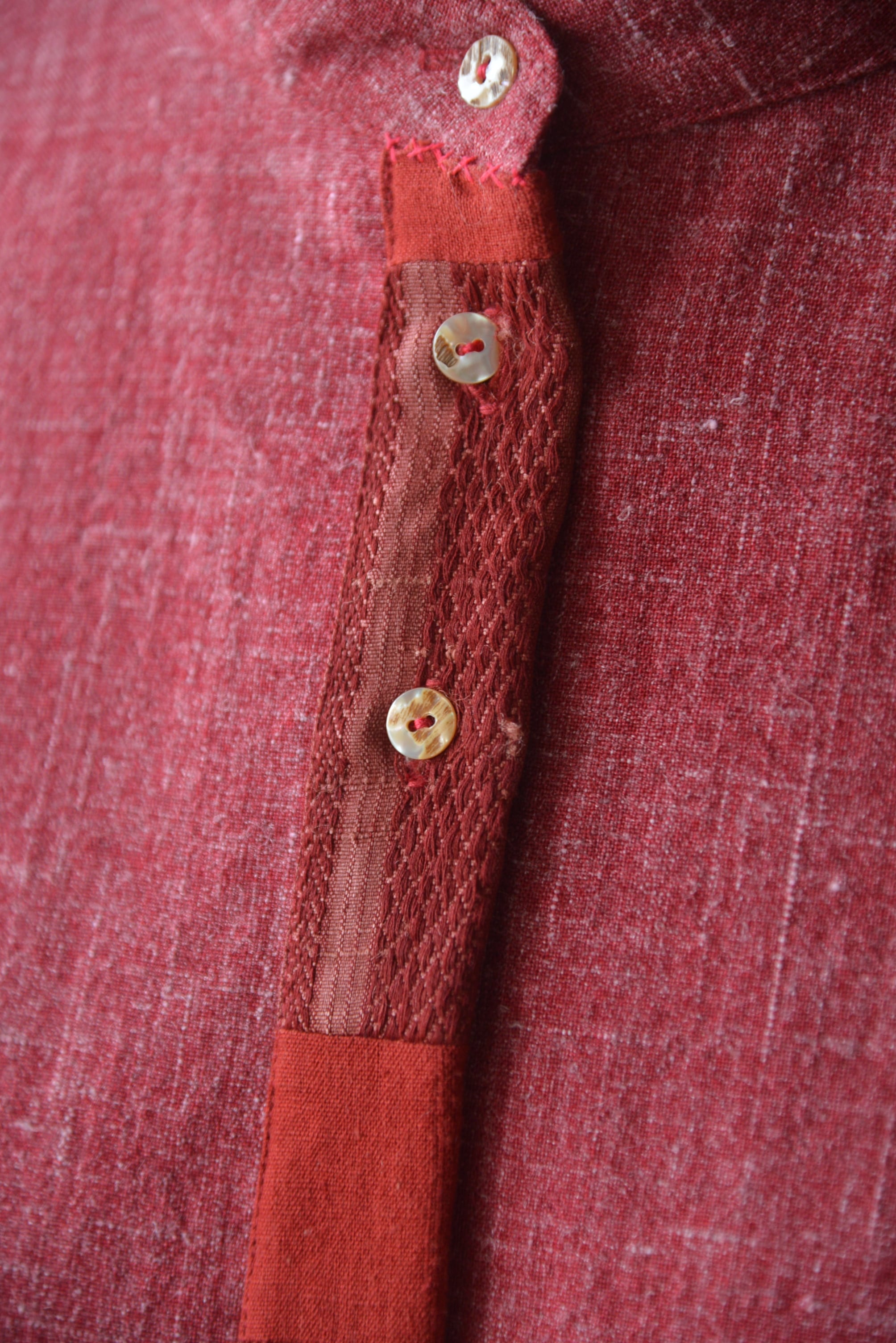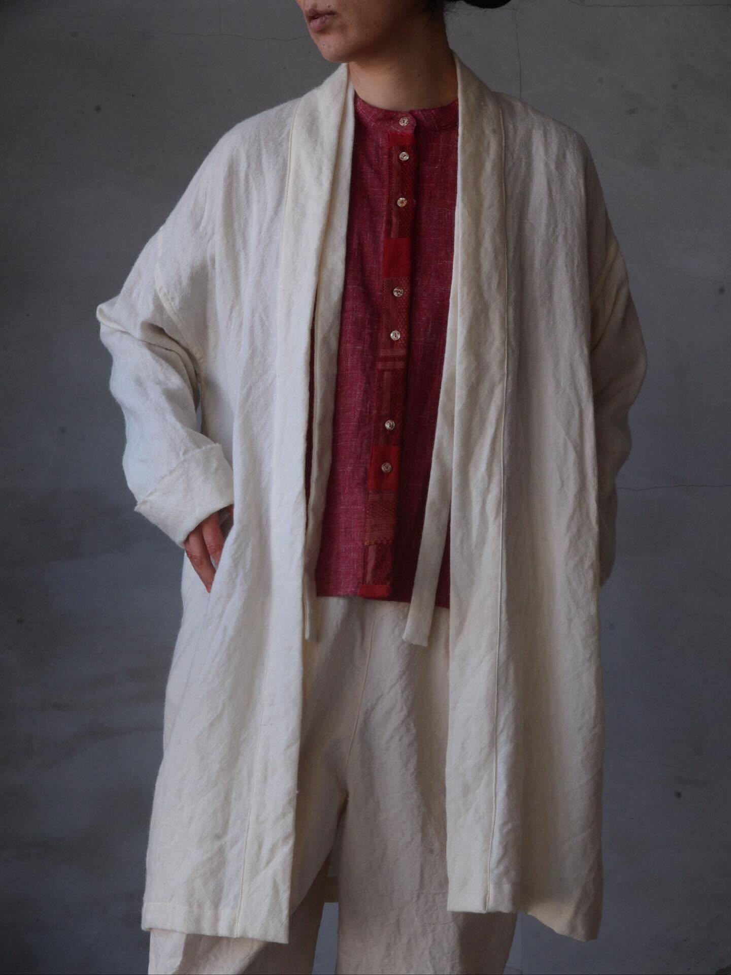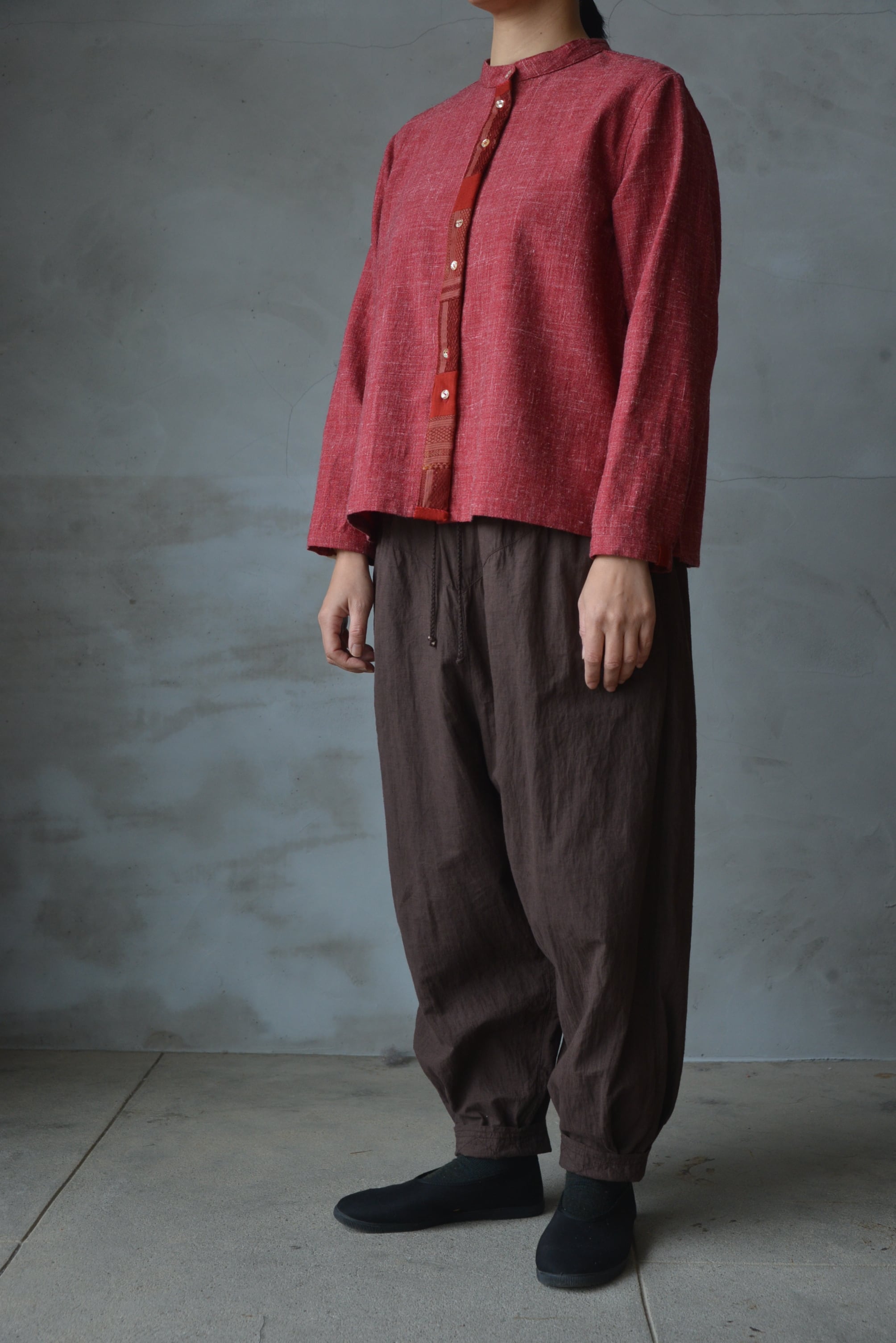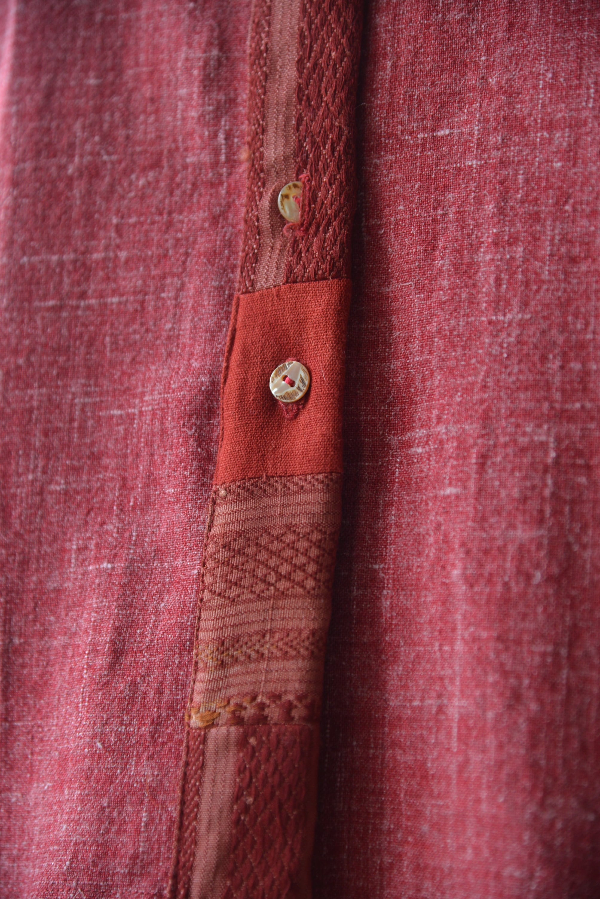 生地は、酸性染料で染まった赤いウールの糸と、染まっていない生成りのヘンプの糸が経緯に入り、アクセントになって表情をつくっています。