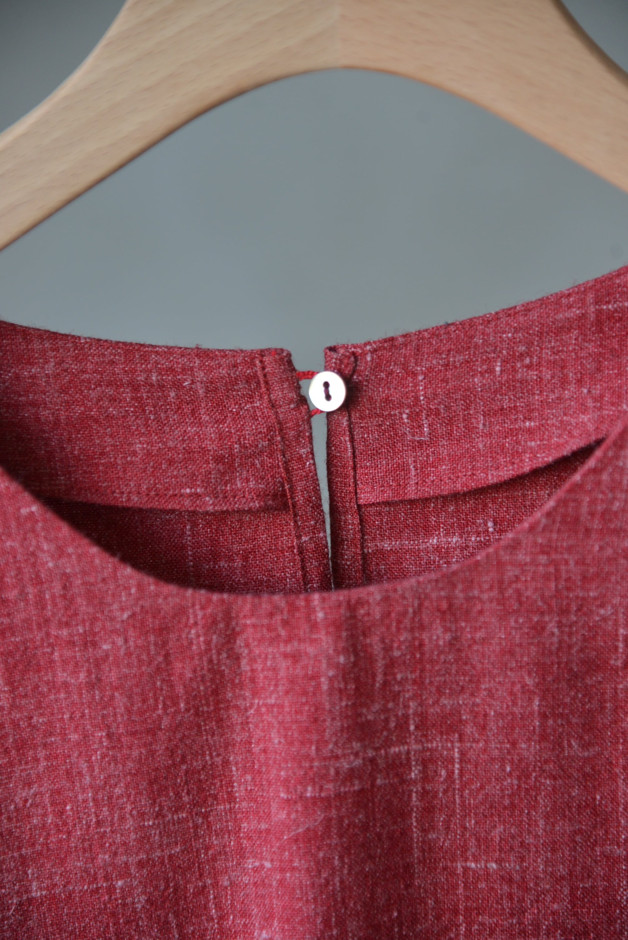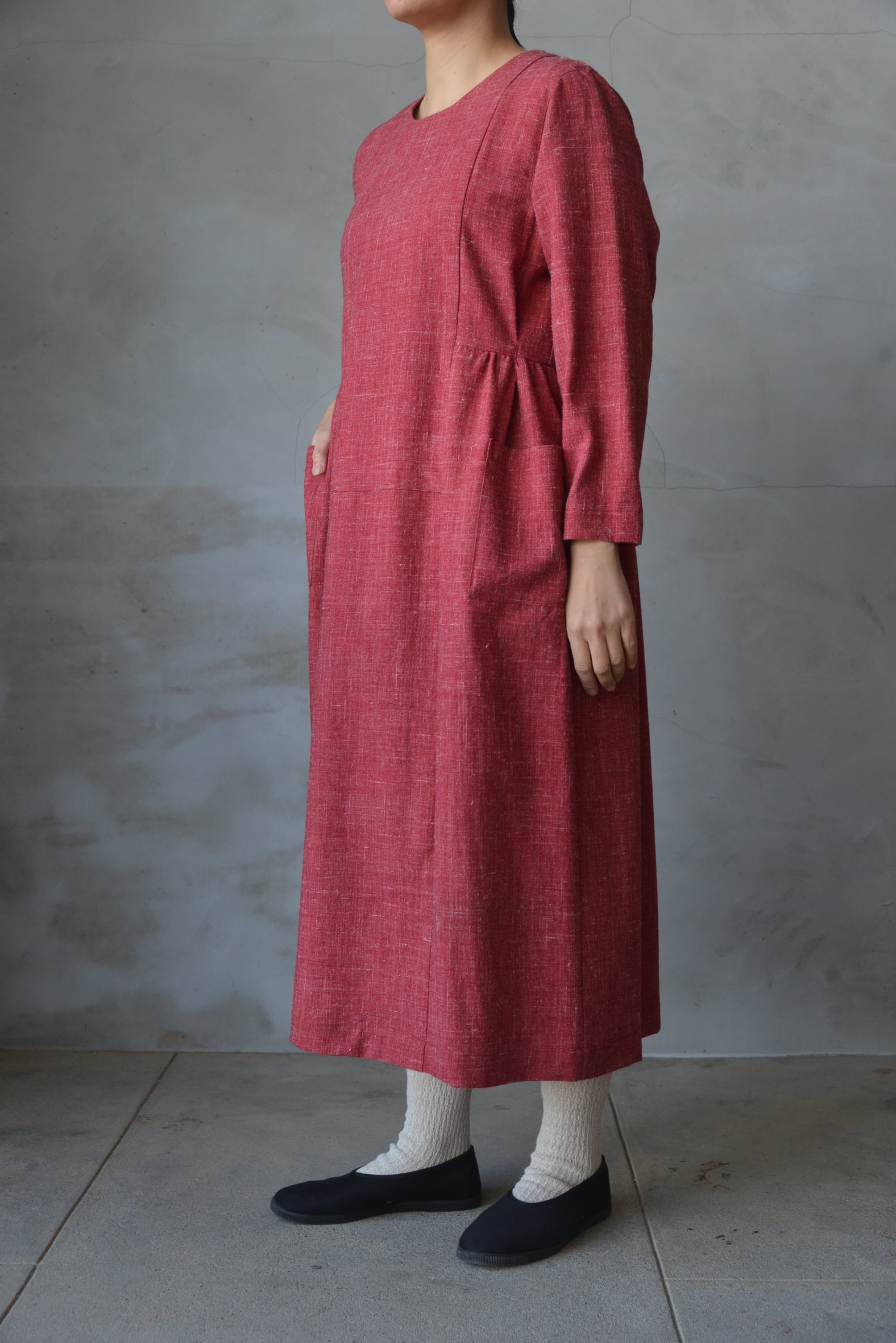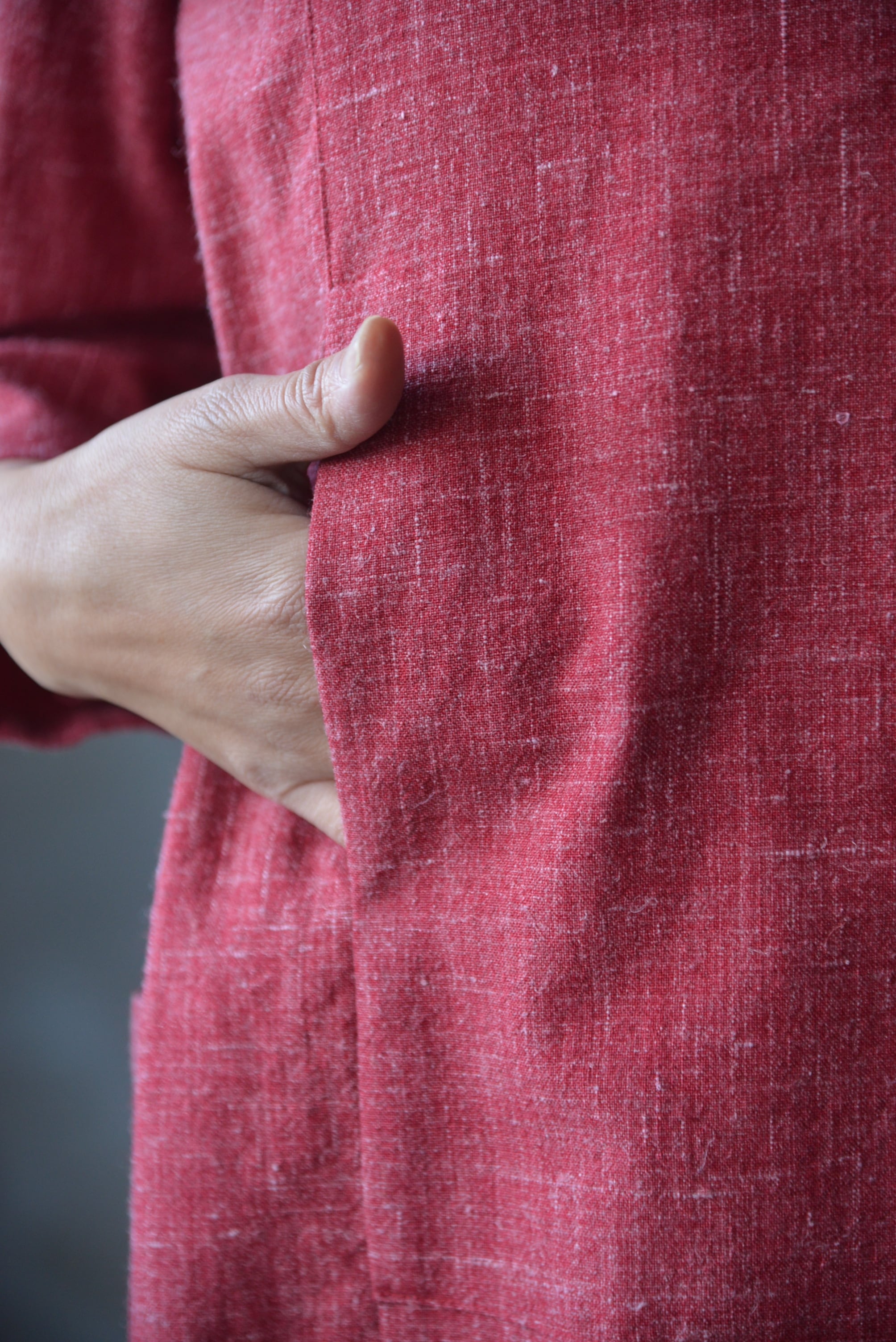 生地は、酸性染料で染まった赤いウールの糸と、染まっていない生成りのヘンプの糸が経緯に入り、アクセントになって表情をつくっています。