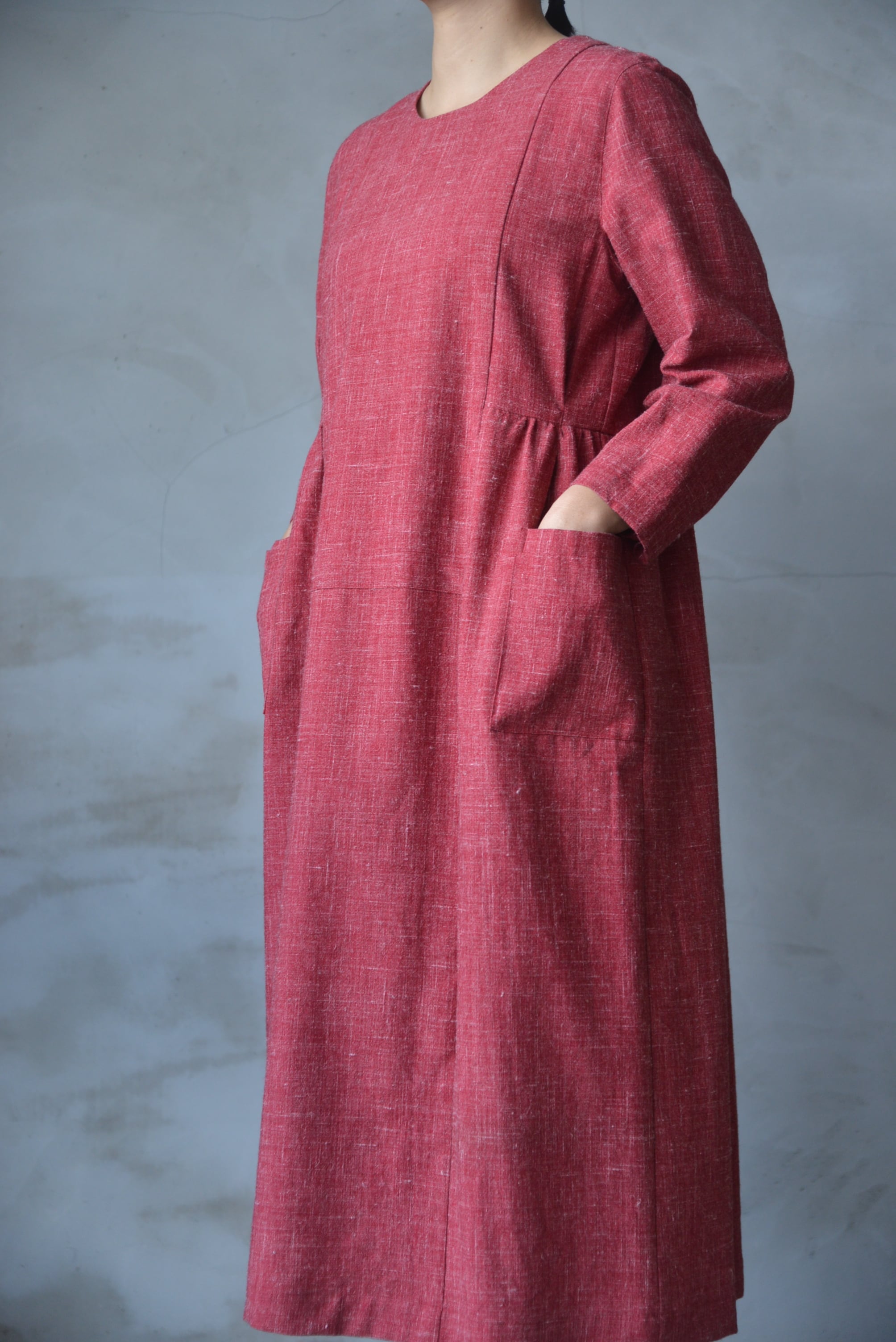 エプロンドレスにあるお腹の大きなポケットは省いた軽い仕様で、こちらのワンピースにもポケットはお腹内側に一つ付いていて、腰にも2つで計3つ。